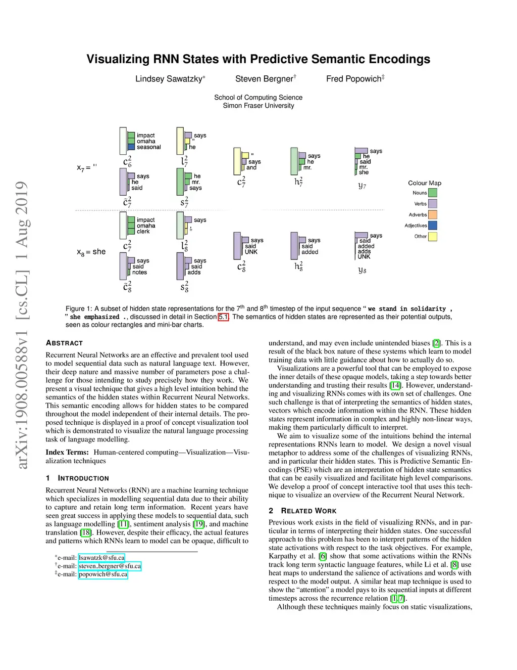 Recurrent Neural Networks are an effective and prevalent tool used to model sequential data such as natural language text. However, their deep nature and massive number of parameters pose a challenge for those intending to study precisely how they work. We present a visual technique that gives a high level intuition behind the semantics of the hidden states within Recurrent Neural Networks. This semantic encoding allows for hidden states to be compared throughout the model independent of their internal details. The proposed technique is displayed in a proof of concept visualization tool which is demonstrated to visualize the natural language processing task of language modelling.