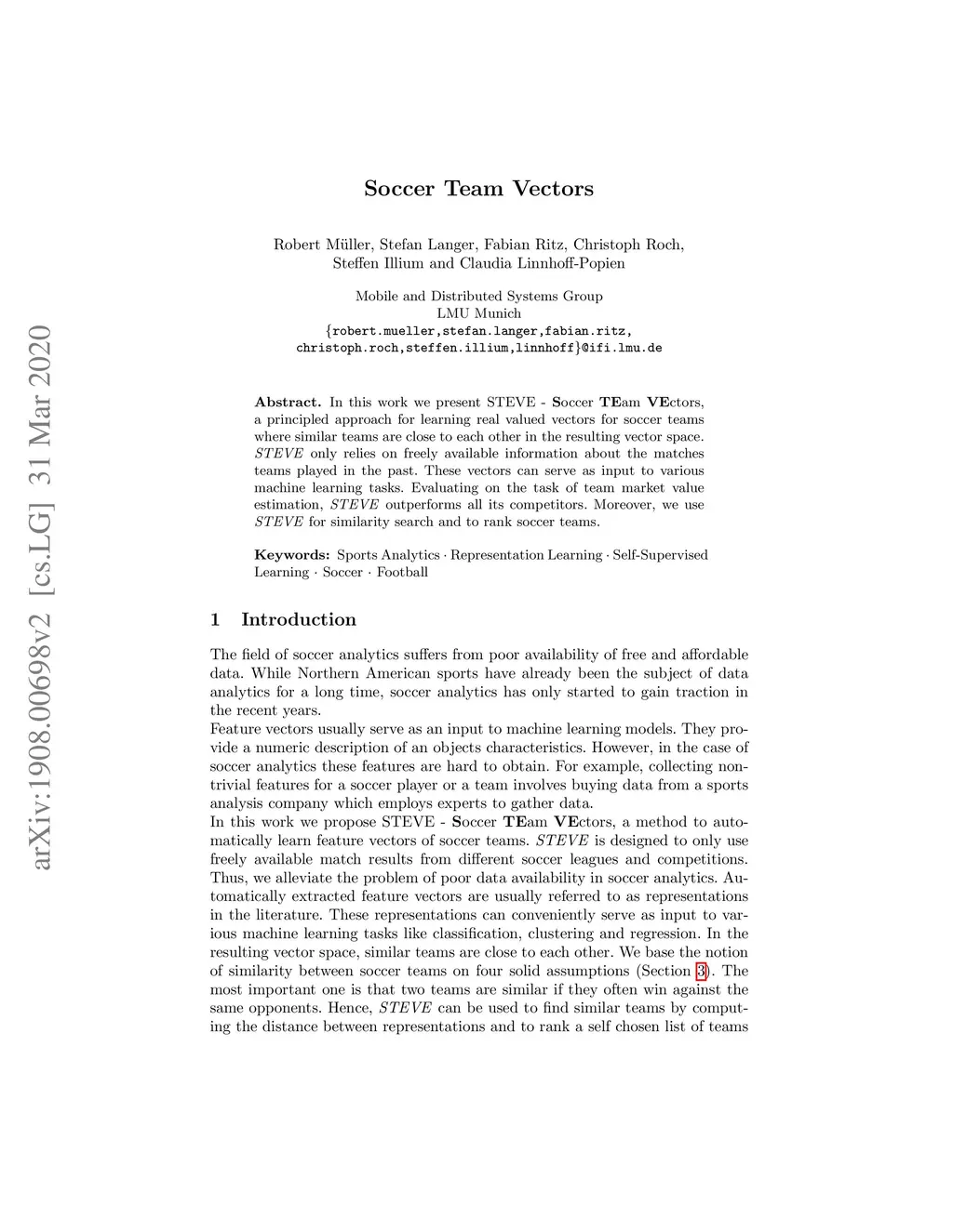 In this work we present STEVE - Soccer TEam VEctors, a principled approach for learning real valued vectors for soccer teams where similar teams are close to each other in the resulting vector space. STEVE only relies on freely available information about the matches teams played in the past. These vectors can serve as input to various machine learning tasks. Evaluating on the task of team market value estimation, STEVE outperforms all its competitors. Moreover, we use STEVE for similarity search and to rank soccer teams.
