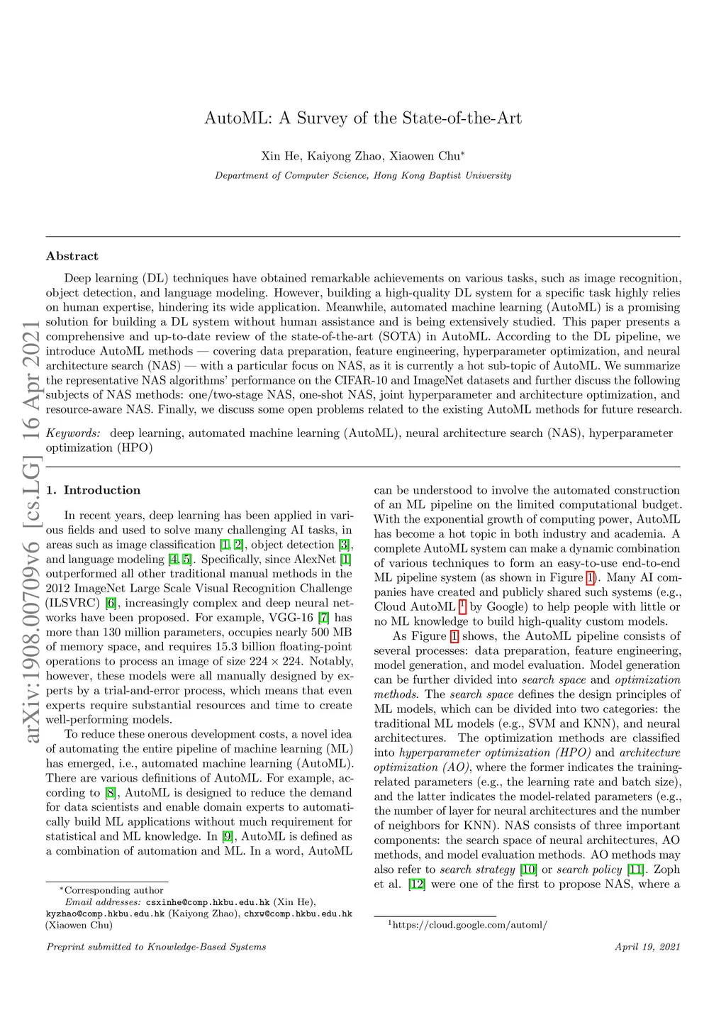 Deep learning (DL) techniques have penetrated all aspects of our lives and brought us great convenience. However, building a high-quality DL system for a specific task highly relies on human expertise, hindering the applications of DL to more areas. Automated machine learning (AutoML) becomes a promising solution to build a DL system without human assistance, and a growing number of researchers focus on AutoML. In this paper, we provide a comprehensive and up-to-date review of the state-of-the-art (SOTA) in AutoML. First, we introduce AutoML methods according to the pipeline, covering data preparation, feature engineering, hyperparameter optimization, and neural architecture search (NAS). We focus more on NAS, as it is currently very hot sub-topic of AutoML. We summarize the performance of the representative NAS algorithms on the CIFAR-10 and ImageNet datasets and further discuss several worthy studying directions of NAS methods: one/two-stage NAS, one-shot NAS, and joint hyperparameter and architecture optimization. Finally, we discuss some open problems of the existing AutoML methods for future research.