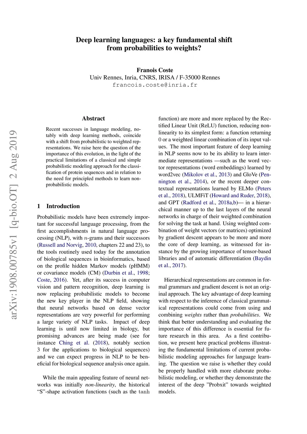 Recent successes in language modeling, notably with deep learning methods, coincide with a shift from probabilistic to weighted representations. We raise here the question of the importance of this evolution, in the light of the practical limitations of a classical and simple probabilistic modeling approach for the classification of protein sequences and in relation to the need for principled methods to learn non-probabilistic models.