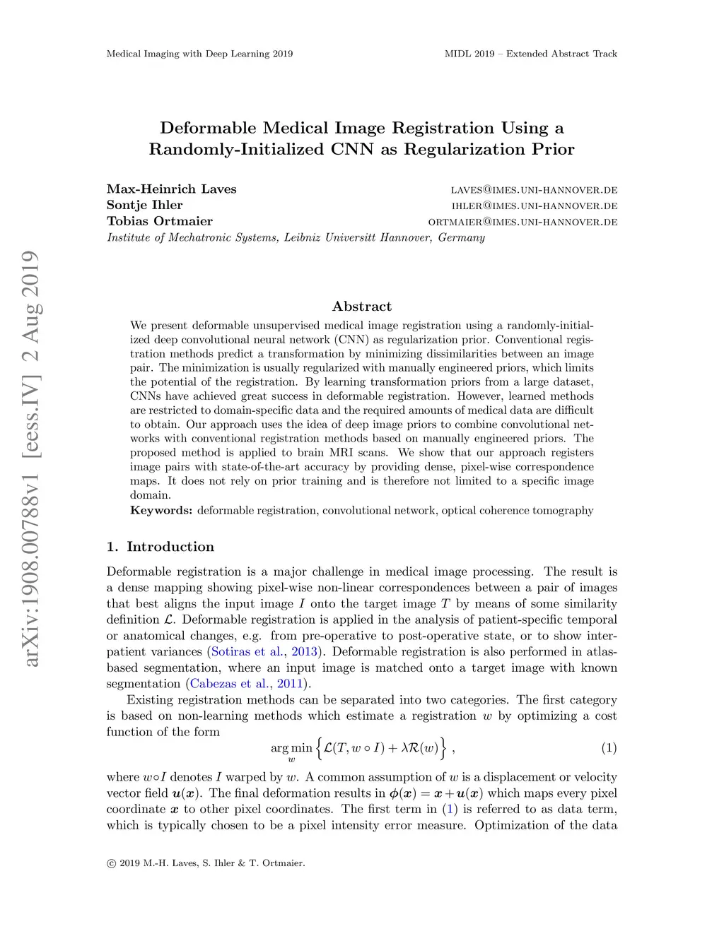 We present deformable unsupervised medical image registration using a randomly-initialized deep convolutional neural network (CNN) as regularization prior. Conventional registration methods predict a transformation by minimizing dissimilarities between an image pair. The minimization is usually regularized with manually engineered priors, which limits the potential of the registration. By learning transformation priors from a large dataset, CNNs have achieved great success in deformable registration. However, learned methods are restricted to domain-specific data and the required amounts of medical data are difficult to obtain. Our approach uses the idea of deep image priors to combine convolutional networks with conventional registration methods based on manually engineered priors. The proposed method is applied to brain MRI scans. We show that our approach registers image pairs with state-of-the-art accuracy by providing dense, pixel-wise correspondence maps. It does not rely on prior training and is therefore not limited to a specific image domain.