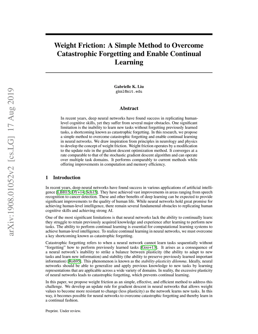 In recent years, deep neural networks have found success in replicating human-level cognitive skills, yet they suffer from several major obstacles. One significant limitation is the inability to learn new tasks without forgetting previously learned tasks, a shortcoming known as catastrophic forgetting. In this research, we propose a simple method to overcome catastrophic forgetting and enable continual learning in neural networks. We draw inspiration from principles in neurology and physics to develop the concept of weight friction. Weight friction operates by a modification to the update rule in the gradient descent optimization method. It converges at a rate comparable to that of the stochastic gradient descent algorithm and can operate over multiple task domains. It performs comparably to current methods while offering improvements in computation and memory efficiency.