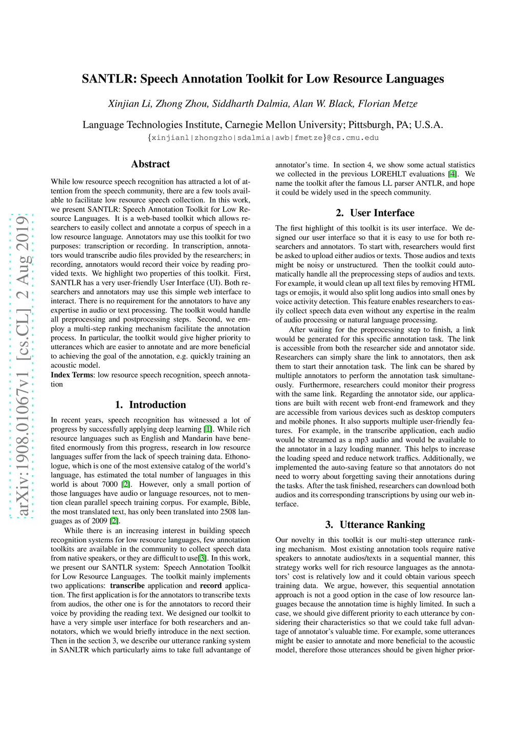 While low resource speech recognition has attracted a lot of attention from the speech community, there are a few tools available to facilitate low resource speech collection. In this work, we present SANTLR: Speech Annotation Toolkit for Low Resource Languages. It is a web-based toolkit which allows researchers to easily collect and annotate a corpus of speech in a low resource language. Annotators may use this toolkit for two purposes: transcription or recording. In transcription, annotators would transcribe audio files provided by the researchers; in recording, annotators would record their voice by reading provided texts. We highlight two properties of this toolkit. First, SANTLR has a very user-friendly User Interface (UI). Both researchers and annotators may use this simple web interface to interact. There is no requirement for the annotators to have any expertise in audio or text processing. The toolkit would handle all preprocessing and postprocessing steps. Second, we employ a multi-step ranking mechanism facilitate the annotation process. In particular, the toolkit would give higher priority to utterances which are easier to annotate and are more beneficial to achieving the goal of the annotation, e.g. quickly training an acoustic model.