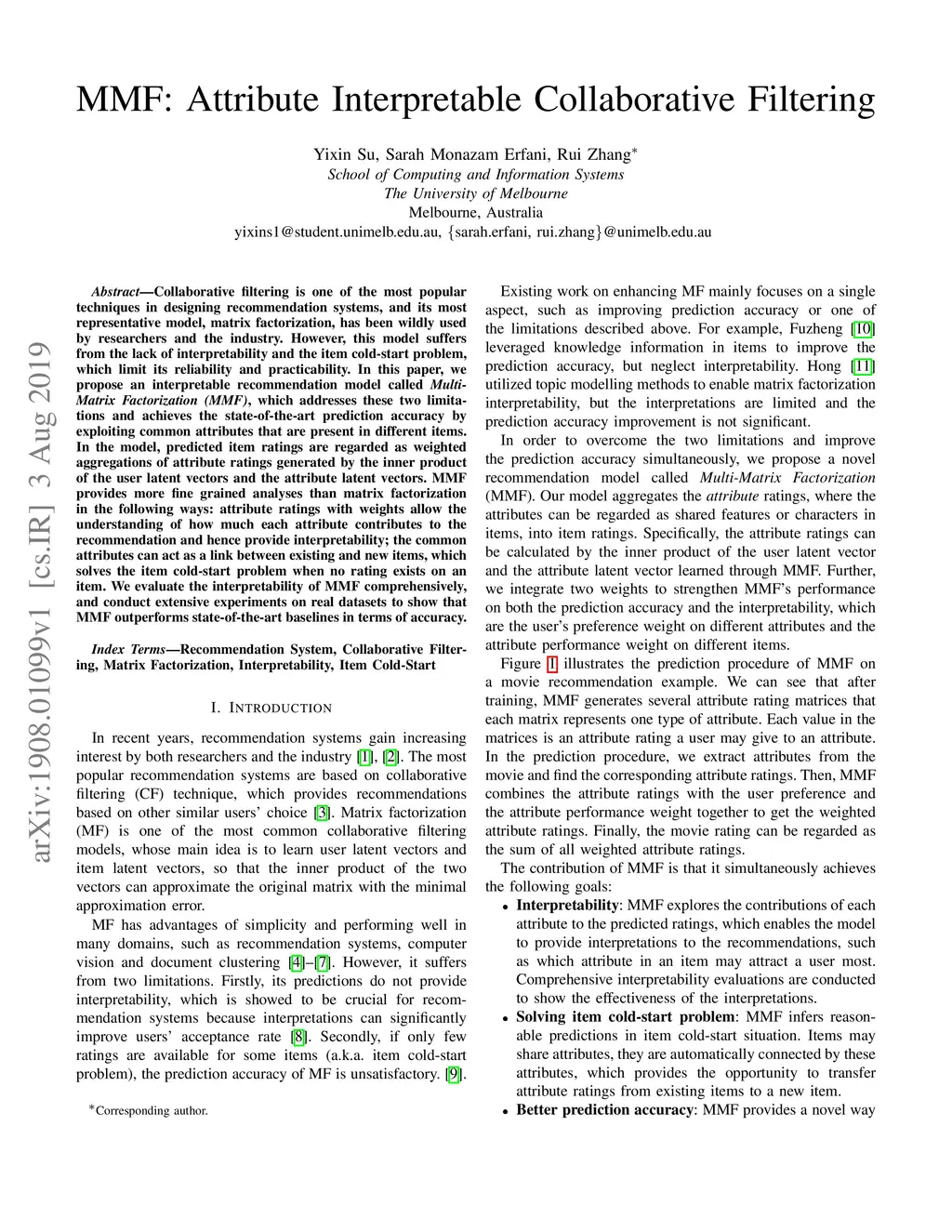 Collaborative filtering is one of the most popular techniques in designing recommendation systems, and its most representative model, matrix factorization, has been wildly used by researchers and the industry. However, this model suffers from the lack of interpretability and the item cold-start problem, which limit its reliability and practicability. In this paper, we propose an interpretable recommendation model called Multi-Matrix Factorization (MMF), which addresses these two limitations and achieves the state-of-the-art prediction accuracy by exploiting common attributes that are present in different items. In the model, predicted item ratings are regarded as weighted aggregations of attribute ratings generated by the inner product of the user latent vectors and the attribute latent vectors. MMF provides more fine grained analyses than matrix factorization in the following ways: attribute ratings with weights allow the understanding of how much each attribute contributes to the recommendation and hence provide interpretability; the common attributes can act as a link between existing and new items, which solves the item cold-start problem when no rating exists on an item. We evaluate the interpretability of MMF comprehensively, and conduct extensive experiments on real datasets to show that MMF outperforms state-of-the-art baselines in terms of accuracy.