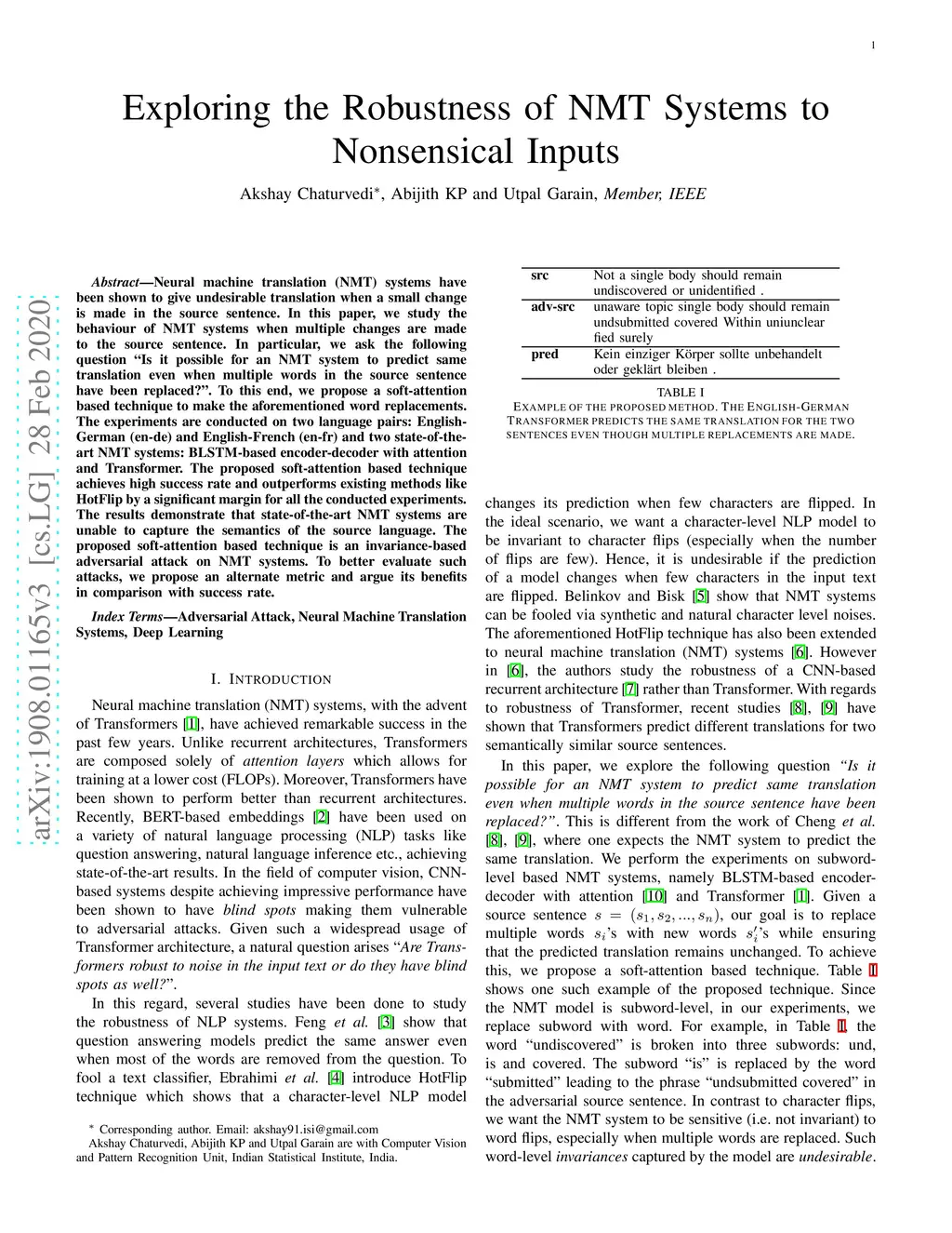Neural machine translation (NMT) systems have been shown to give undesirable translation when a small change is made in the source sentence. In this paper, we study the behaviour of NMT systems when multiple changes are made to the source sentence. In particular, we ask the following question "Is it possible for an NMT system to predict same translation even when multiple words in the source sentence have been replaced?". To this end, we propose a soft-attention based technique to make the aforementioned word replacements. The experiments are conducted on two language pairs: English-German (en-de) and English-French (en-fr) and two state-of-the-art NMT systems: BLSTM-based encoder-decoder with attention and Transformer. The proposed soft-attention based technique achieves high success rate and outperforms existing methods like HotFlip by a significant margin for all the conducted experiments. The results demonstrate that state-of-the-art NMT systems are unable to capture the semantics of the source language. The proposed soft-attention based technique is an invariance-based adversarial attack on NMT systems. To better evaluate such attacks, we propose an alternate metric and argue its benefits in comparison with success rate.