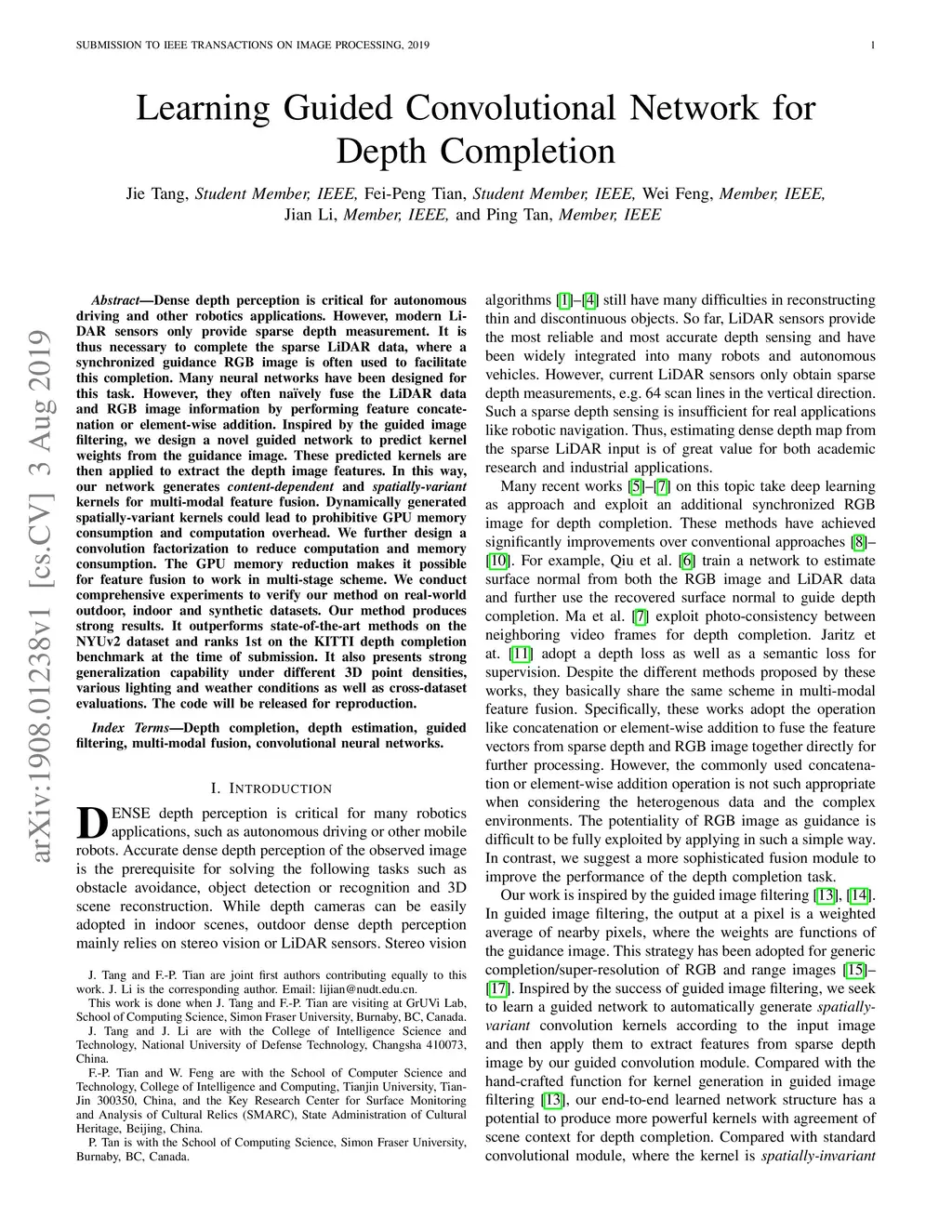 Dense depth perception is critical for autonomous driving and other robotics applications. However, modern LiDAR sensors only provide sparse depth measurement. It is thus necessary to complete the sparse LiDAR data, where a synchronized guidance RGB image is often used to facilitate this completion. Many neural networks have been designed for this task. However, they often na\"{\i}vely fuse the LiDAR data and RGB image information by performing feature concatenation or element-wise addition. Inspired by the guided image filtering, we design a novel guided network to predict kernel weights from the guidance image. These predicted kernels are then applied to extract the depth image features. In this way, our network generates content-dependent and spatially-variant kernels for multi-modal feature fusion. Dynamically generated spatially-variant kernels could lead to prohibitive GPU memory consumption and computation overhead. We further design a convolution factorization to reduce computation and memory consumption. The GPU memory reduction makes it possible for feature fusion to work in multi-stage scheme. We conduct comprehensive experiments to verify our method on real-world outdoor, indoor and synthetic datasets. Our method produces strong results. It outperforms state-of-the-art methods on the NYUv2 dataset and ranks 1st on the KITTI depth completion benchmark at the time of submission. It also presents strong generalization capability under different 3D point densities, various lighting and weather conditions as well as cross-dataset evaluations. The code will be released for reproduction.