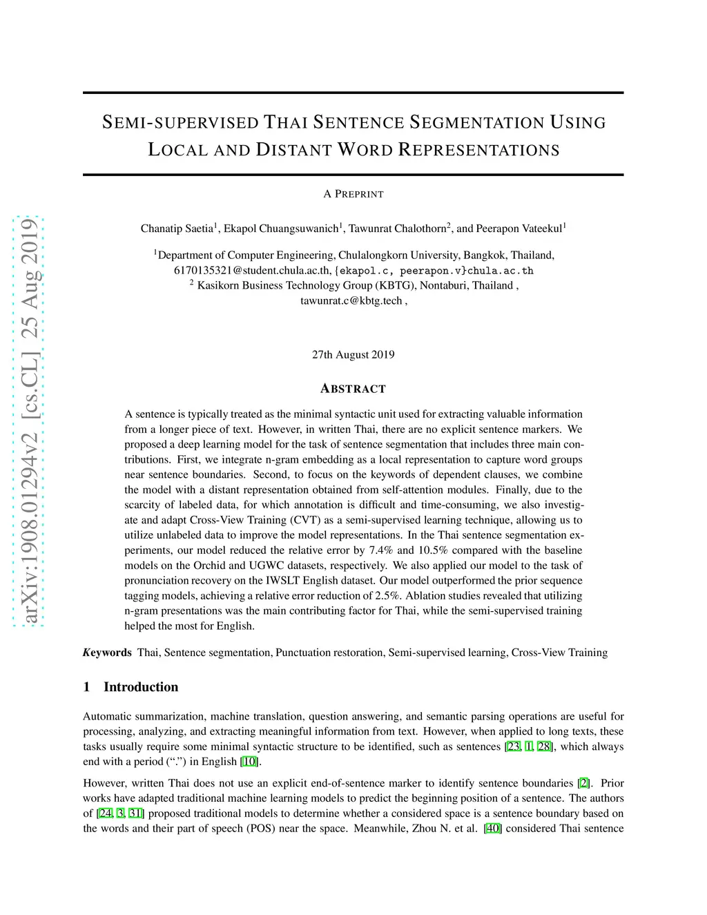 A sentence is typically treated as the minimal syntactic unit used for extracting valuable information from a longer piece of text. However, in written Thai, there are no explicit sentence markers. We proposed a deep learning model for the task of sentence segmentation that includes three main contributions. First, we integrate n-gram embedding as a local representation to capture word groups near sentence boundaries. Second, to focus on the keywords of dependent clauses, we combine the model with a distant representation obtained from self-attention modules. Finally, due to the scarcity of labeled data, for which annotation is difficult and time-consuming, we also investigate and adapt Cross-View Training (CVT) as a semi-supervised learning technique, allowing us to utilize unlabeled data to improve the model representations. In the Thai sentence segmentation experiments, our model reduced the relative error by 7.4% and 10.5% compared with the baseline models on the Orchid and UGWC datasets, respectively. We also applied our model to the task of pronunciation recovery on the IWSLT English dataset. Our model outperformed the prior sequence tagging models, achieving a relative error reduction of 2.5%. Ablation studies revealed that utilizing n-gram presentations was the main contributing factor for Thai, while the semi-supervised training helped the most for English.