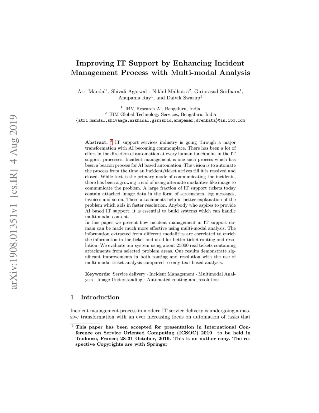 IT support services industry is going through a major transformation with AI becoming commonplace. There has been a lot of effort in the direction of automation at every human touchpoint in the IT support processes. Incident management is one such process which has been a beacon process for AI based automation. The vision is to automate the process from the time an incident/ticket arrives till it is resolved and closed. While text is the primary mode of communicating the incidents, there has been a growing trend of using alternate modalities like image to communicate the problem. A large fraction of IT support tickets today contain attached image data in the form of screenshots, log messages, invoices and so on. These attachments help in better explanation of the problem which aids in faster resolution. Anybody who aspires to provide AI based IT support, it is essential to build systems which can handle multi-modal content. In this paper we present how incident management in IT support domain can be made much more effective using multi-modal analysis. The information extracted from different modalities are correlated to enrich the information in the ticket and used for better ticket routing and resolution. We evaluate our system using about 25000 real tickets containing attachments from selected problem areas. Our results demonstrate significant improvements in both routing and resolution with the use of multi-modal ticket analysis compared to only text based analysis.