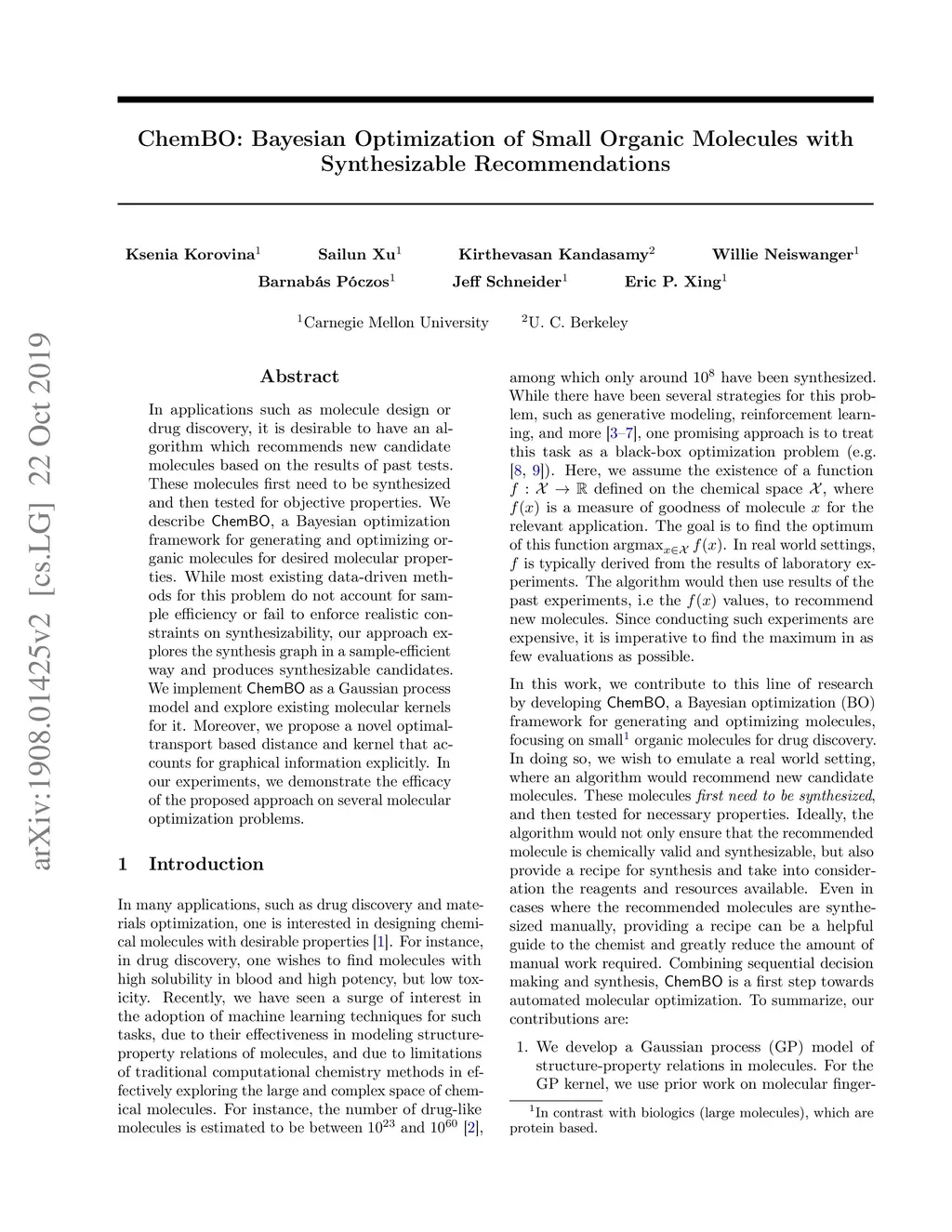 ChemBO: Bayesian Optimization of Small Organic Molecules with