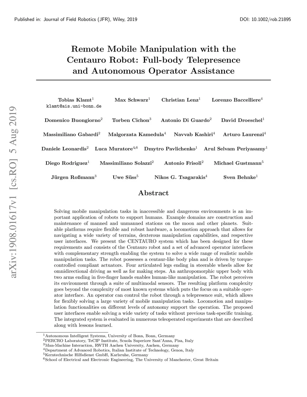 Remote Mobile Manipulation with the Centauro Robot: Full-body