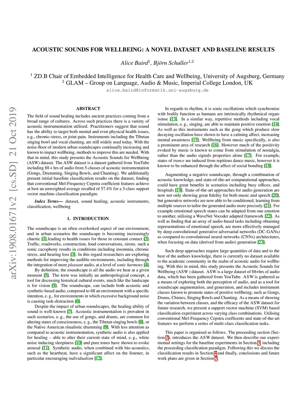 The field of sound healing includes ancient practices coming from a broad range of cultures. Across such practices there is a variety of acoustic instrumentation utilised. Practitioners suggest that sound has the ability to target both mental and even physical health issues, e.g., chronic-stress, or joint-pain. Instruments including the Tibetan singing bowl and vocal chanting, are still widely used today. With the noise-floor of modern urban soundscapes continually increasing and known to impact wellbeing, methods to improve this are needed. With that in mind, this study presents the Acoustic Sounds for Wellbeing (ASW) dataset. The ASW dataset is a dataset gathered from YouTube including 88\,+ hrs of audio from 5-classes of acoustic instrumentation (Gongs, Drumming, Singing Bowls, and Chanting). We additionally present initial baseline classification results on the dataset, finding that conventional Mel-Frequency Cepstra coefficient features achieve at best an unweighted average recalled of 57.4 % for a 5-class support vector machine classification paradigm.