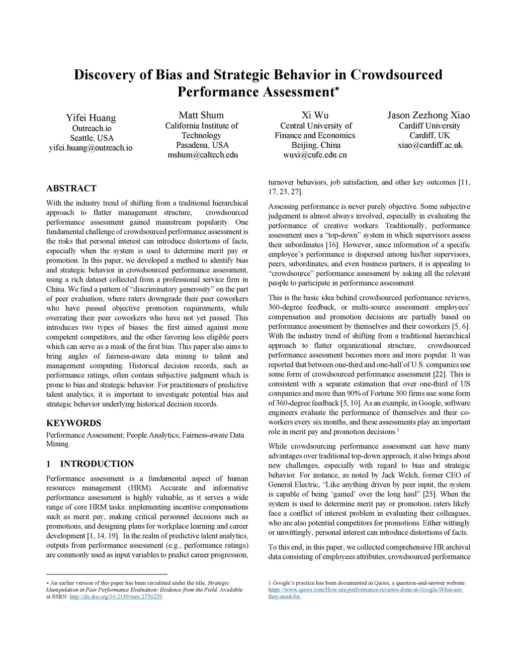 With the industry trend of shifting from a traditional hierarchical approach to flatter management structure, crowdsourced performance assessment gained mainstream popularity. One fundamental challenge of crowdsourced performance assessment is the risks that personal interest can introduce distortions of facts, especially when the system is used to determine merit pay or promotion. In this paper, we developed a method to identify bias and strategic behavior in crowdsourced performance assessment, using a rich dataset collected from a professional service firm in China. We find a pattern of "discriminatory generosity" on the part of peer evaluation, where raters downgrade their peer coworkers who have passed objective promotion requirements while overrating their peer coworkers who have not yet passed. This introduces two types of biases: the first aimed against more competent competitors, and the other favoring less eligible peers which can serve as a mask of the first bias. This paper also aims to bring angles of fairness-aware data mining to talent and management computing. Historical decision records, such as performance ratings, often contain subjective judgment which is prone to bias and strategic behavior. For practitioners of predictive talent analytics, it is important to investigate potential bias and strategic behavior underlying historical decision records.