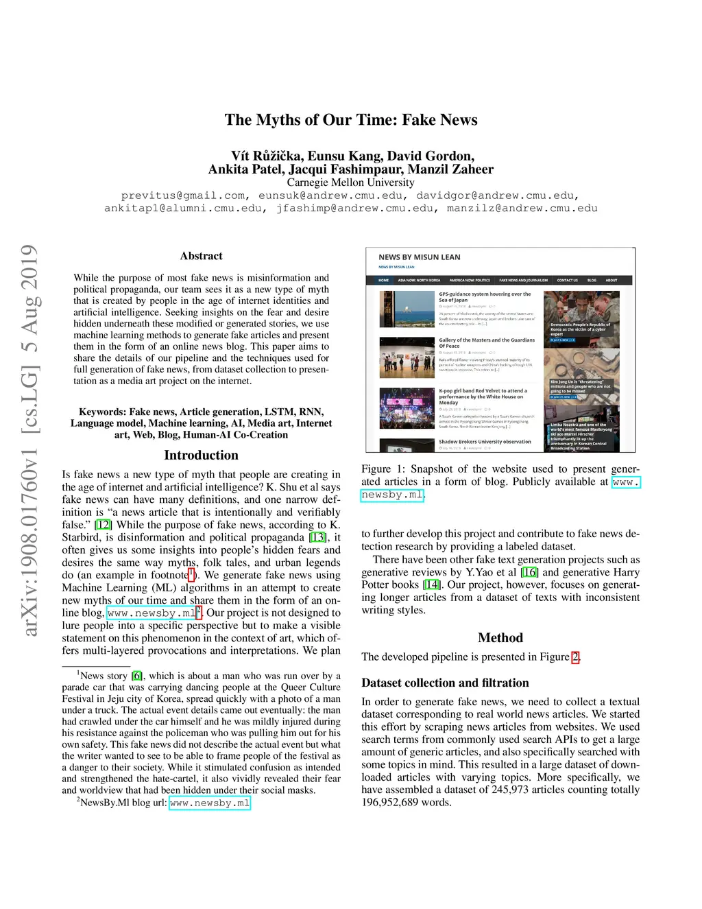 While the purpose of most fake news is misinformation and political propaganda, our team sees it as a new type of myth that is created by people in the age of internet identities and artificial intelligence. Seeking insights on the fear and desire hidden underneath these modified or generated stories, we use machine learning methods to generate fake articles and present them in the form of an online news blog. This paper aims to share the details of our pipeline and the techniques used for full generation of fake news, from dataset collection to presentation as a media art project on the internet.
