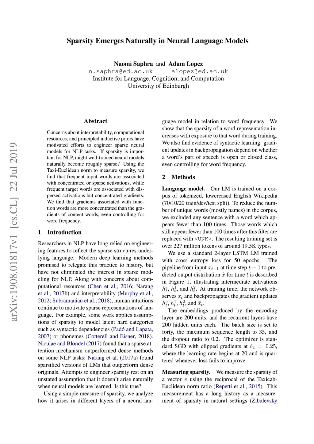 Concerns about interpretability, computational resources, and principled inductive priors have motivated efforts to engineer sparse neural models for NLP tasks. If sparsity is important for NLP, might well-trained neural models naturally become roughly sparse? Using the Taxi-Euclidean norm to measure sparsity, we find that frequent input words are associated with concentrated or sparse activations, while frequent target words are associated with dispersed activations but concentrated gradients. We find that gradients associated with function words are more concentrated than the gradients of content words, even controlling for word frequency.