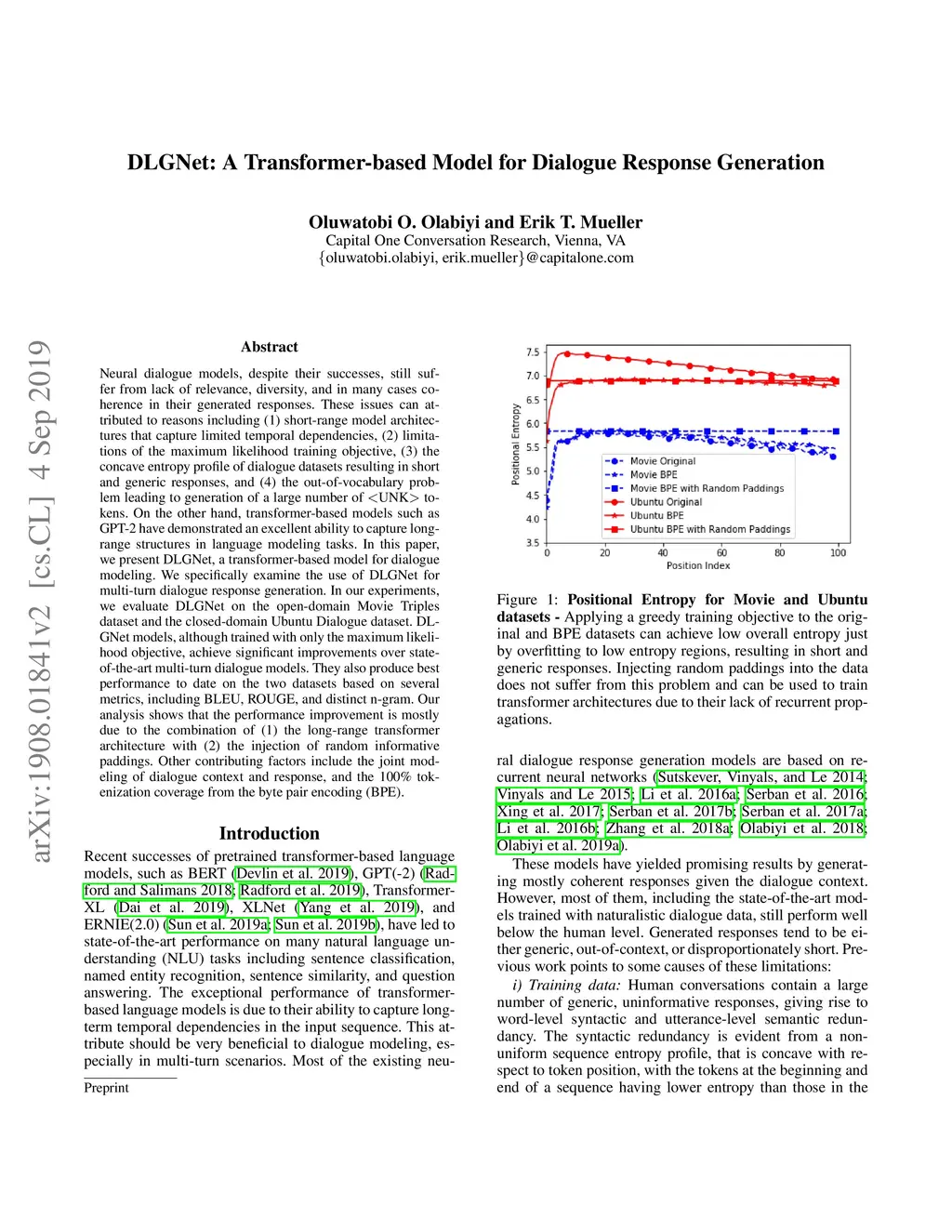 Neural dialogue models, despite their successes, still suffer from lack of relevance, diversity, and in many cases coherence in their generated responses. These issues can attributed to reasons including (1) short-range model architectures that capture limited temporal dependencies, (2) limitations of the maximum likelihood training objective, (3) the concave entropy profile of dialogue datasets resulting in short and generic responses, and (4) the out-of-vocabulary problem leading to generation of a large number of <UNK> tokens. On the other hand, transformer-based models such as GPT-2 have demonstrated an excellent ability to capture long-range structures in language modeling tasks. In this paper, we present DLGNet, a transformer-based model for dialogue modeling. We specifically examine the use of DLGNet for multi-turn dialogue response generation. In our experiments, we evaluate DLGNet on the open-domain Movie Triples dataset and the closed-domain Ubuntu Dialogue dataset. DLGNet models, although trained with only the maximum likelihood objective, achieve significant improvements over state-of-the-art multi-turn dialogue models. They also produce best performance to date on the two datasets based on several metrics, including BLEU, ROUGE, and distinct n-gram. Our analysis shows that the performance improvement is mostly due to the combination of (1) the long-range transformer architecture with (2) the injection of random informative paddings. Other contributing factors include the joint modeling of dialogue context and response, and the 100% tokenization coverage from the byte pair encoding (BPE).