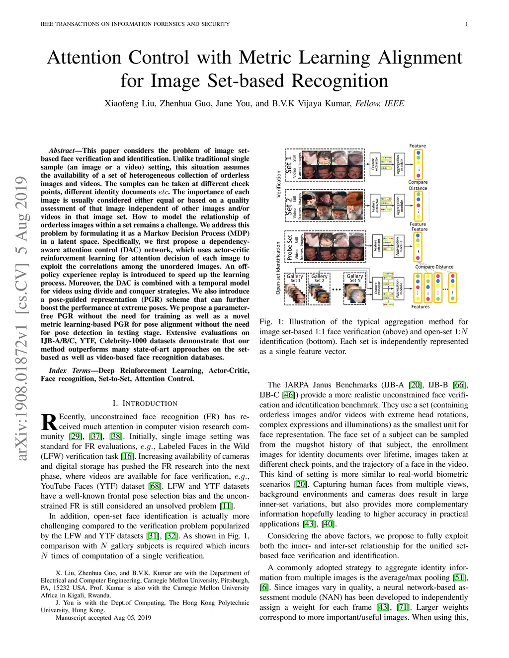 This paper considers the problem of image set-based face verification and identification. Unlike traditional single sample (an image or a video) setting, this situation assumes the availability of a set of heterogeneous collection of orderless images and videos. The samples can be taken at different check points, different identity documents . The importance of each image is usually considered either equal or based on a quality assessment of that image independent of other images and/or videos in that image set. How to model the relationship of orderless images within a set remains a challenge. We address this problem by formulating it as a Markov Decision Process (MDP) in a latent space. Specifically, we first propose a dependency-aware attention control (DAC) network, which uses actor-critic reinforcement learning for attention decision of each image to exploit the correlations among the unordered images. An off-policy experience replay is introduced to speed up the learning process. Moreover, the DAC is combined with a temporal model for videos using divide and conquer strategies. We also introduce a pose-guided representation (PGR) scheme that can further boost the performance at extreme poses. We propose a parameter-free PGR without the need for training as well as a novel metric learning-based PGR for pose alignment without the need for pose detection in testing stage. Extensive evaluations on IJB-A/B/C, YTF, Celebrity-1000 datasets demonstrate that our method outperforms many state-of-art approaches on the set-based as well as video-based face recognition databases.