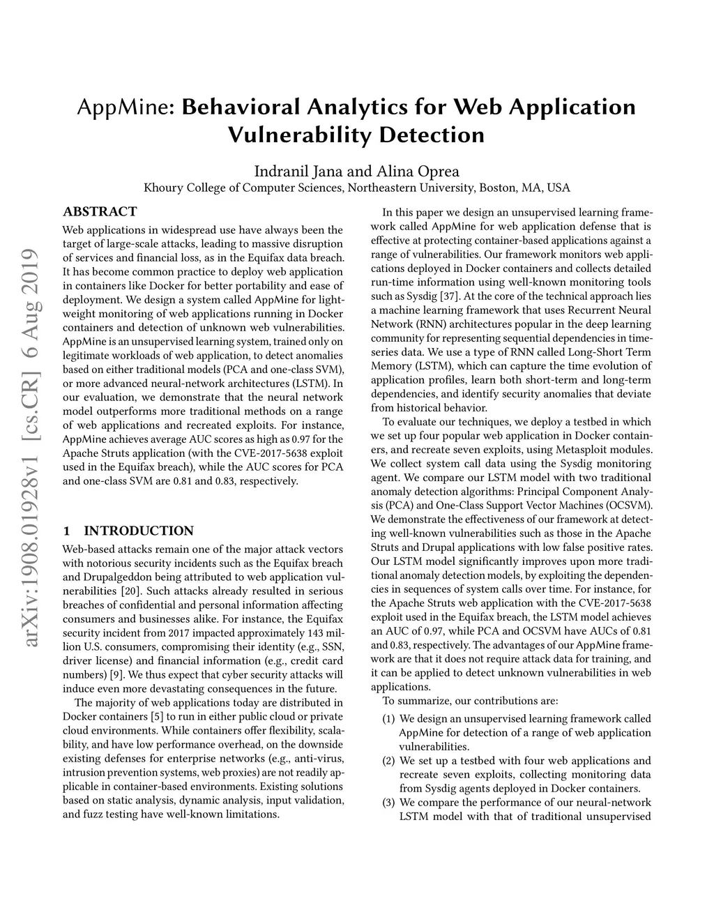 Web applications in widespread use have always been the target of large-scale attacks, leading to massive disruption of services and financial loss, as in the Equifax data breach. It has become common practice to deploy web application in containers like Docker for better portability and ease of deployment. We design a system called AppMine for lightweight monitoring of web applications running in Docker containers and detection of unknown web vulnerabilities. AppMine is an unsupervised learning system, trained only on legitimate workloads of web application, to detect anomalies based on either traditional models (PCA and one-class SVM), or more advanced neural-network architectures (LSTM). In our evaluation, we demonstrate that the neural network model outperforms more traditional methods on a range of web applications and recreated exploits. For instance, AppMine achieves average AUC scores as high as 0.97 for the Apache Struts application (with the CVE-2017-5638 exploit used in the Equifax breach), while the AUC scores for PCA and one-class SVM are 0.81 and 0.83, respectively.