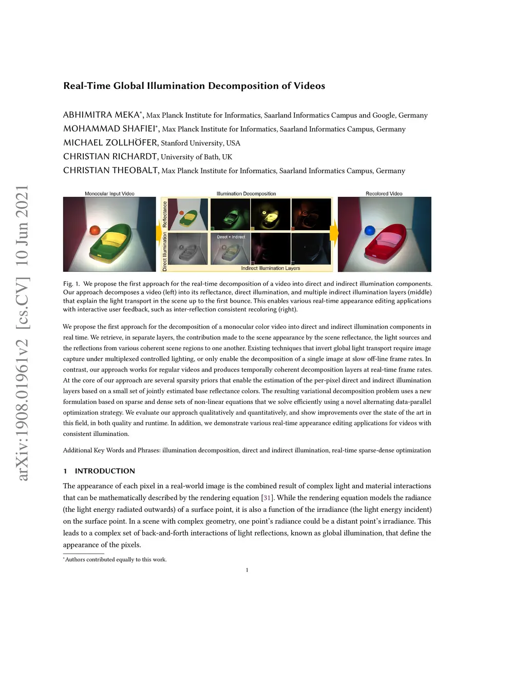 We propose the first approach for the decomposition of a monocular color video into direct and indirect illumination components in real time. We retrieve, in separate layers, the contribution made to the scene appearance by the scene reflectance, the light sources and the reflections from various coherent scene regions to one another. Existing techniques that invert global light transport require image capture under multiplexed controlled lighting, or only enable the decomposition of a single image at slow off-line frame rates. In contrast, our approach works for regular videos and produces temporally coherent decomposition layers at real-time frame rates. At the core of our approach are several sparsity priors that enable the estimation of the per-pixel direct and indirect illumination layers based on a small set of jointly estimated base reflectance colors. The resulting variational decomposition problem uses a new formulation based on sparse and dense sets of non-linear equations that we solve efficiently using a novel alternating data-parallel optimization strategy. We evaluate our approach qualitatively and quantitatively, and show improvements over the state of the art in this field, in both quality and runtime. In addition, we demonstrate various real-time appearance editing applications for videos with consistent illumination.