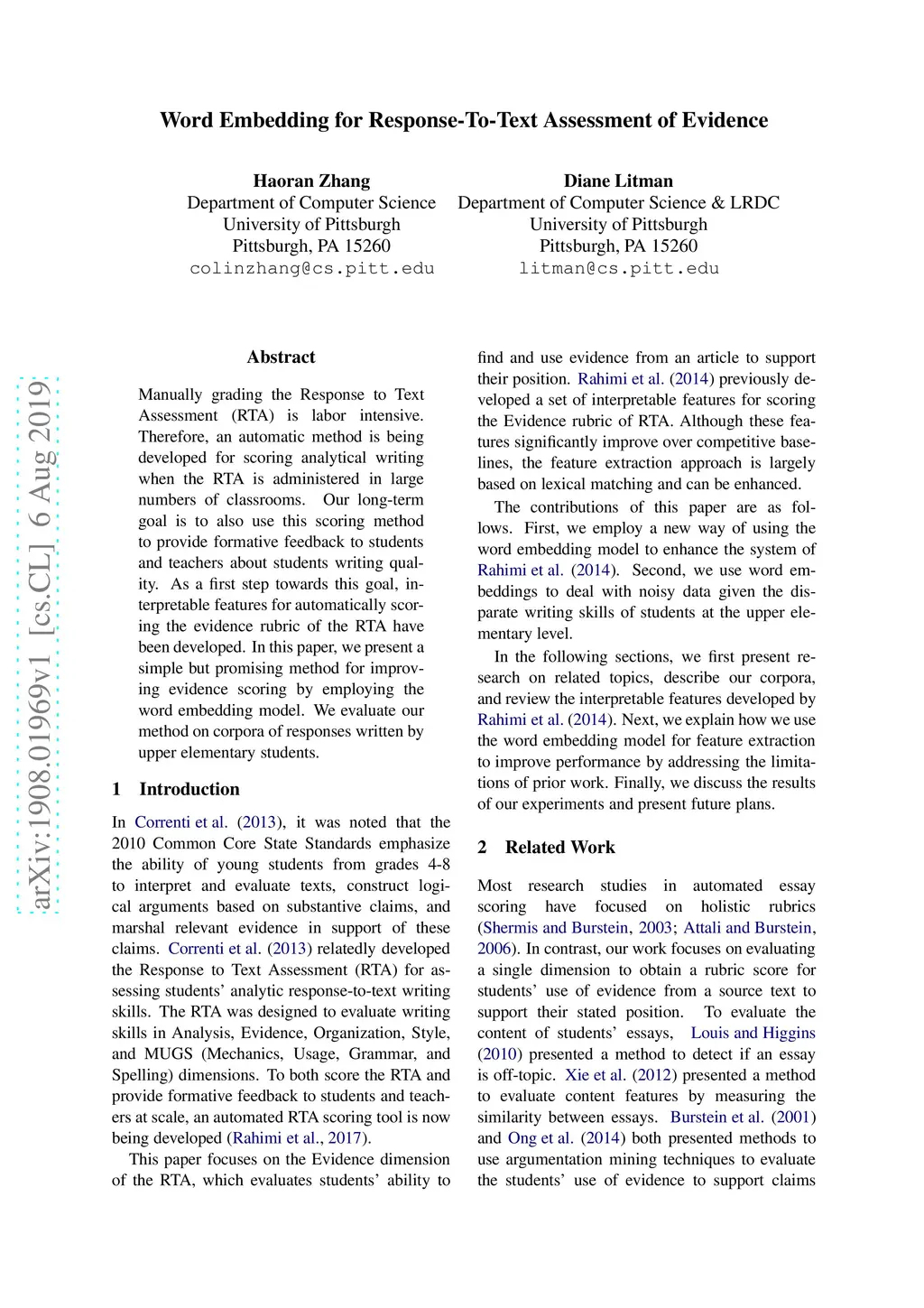 Manually grading the Response to Text Assessment (RTA) is labor intensive. Therefore, an automatic method is being developed for scoring analytical writing when the RTA is administered in large numbers of classrooms. Our long-term goal is to also use this scoring method to provide formative feedback to students and teachers about students' writing quality. As a first step towards this goal, interpretable features for automatically scoring the evidence rubric of the RTA have been developed. In this paper, we present a simple but promising method for improving evidence scoring by employing the word embedding model. We evaluate our method on corpora of responses written by upper elementary students.