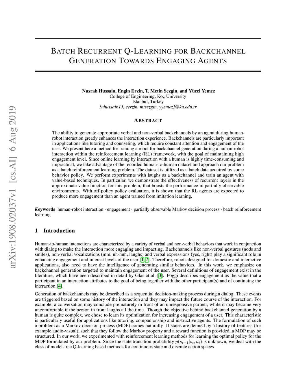 Batch Recurrent Q-Learning for Backchannel Generation Towards Engaging