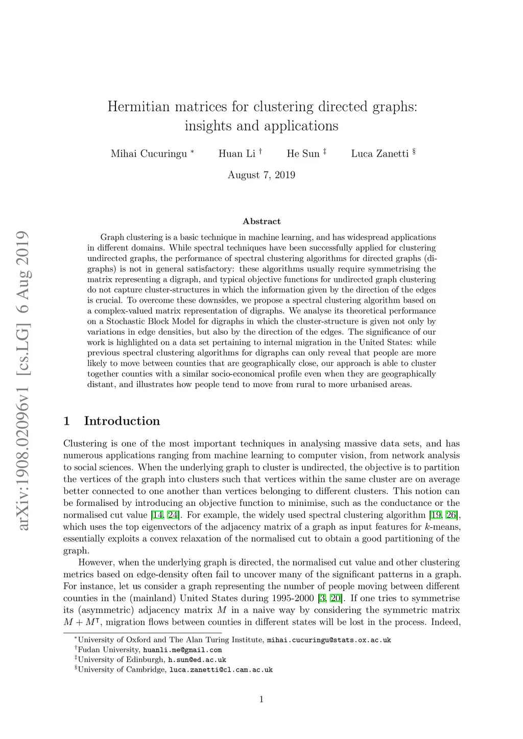 Graph clustering is a basic technique in machine learning, and has widespread applications in different domains. While spectral techniques have been successfully applied for clustering undirected graphs, the performance of spectral clustering algorithms for directed graphs (digraphs) is not in general satisfactory: these algorithms usually require symmetrising the matrix representing a digraph, and typical objective functions for undirected graph clustering do not capture cluster-structures in which the information given by the direction of the edges is crucial. To overcome these downsides, we propose a spectral clustering algorithm based on a complex-valued matrix representation of digraphs. We analyse its theoretical performance on a Stochastic Block Model for digraphs in which the cluster-structure is given not only by variations in edge densities, but also by the direction of the edges. The significance of our work is highlighted on a data set pertaining to internal migration in the United States: while previous spectral clustering algorithms for digraphs can only reveal that people are more likely to move between counties that are geographically close, our approach is able to cluster together counties with a similar socio-economical profile even when they are geographically distant, and illustrates how people tend to move from rural to more urbanised areas.