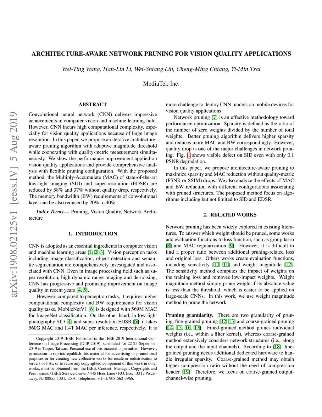 Convolutional neural network (CNN) delivers impressive achievements in computer vision and machine learning field. However, CNN incurs high computational complexity, especially for vision quality applications because of large image resolution. In this paper, we propose an iterative architecture-aware pruning algorithm with adaptive magnitude threshold while cooperating with quality-metric measurement simultaneously. We show the performance improvement applied on vision quality applications and provide comprehensive analysis with flexible pruning configuration. With the proposed method, the Multiply-Accumulate (MAC) of state-of-the-art low-light imaging (SID) and super-resolution (EDSR) are reduced by 58% and 37% without quality drop, respectively. The memory bandwidth (BW) requirements of convolutional layer can be also reduced by 20% to 40%.