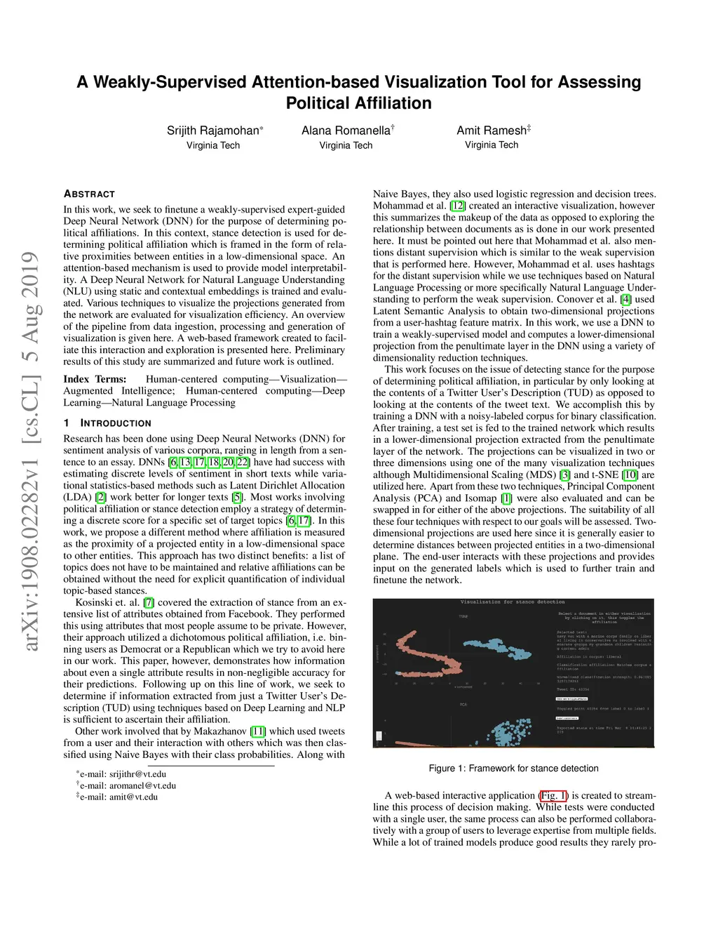 In this work, we seek to finetune a weakly-supervised expert-guided Deep Neural Network (DNN) for the purpose of determining political affiliations. In this context, stance detection is used for determining political affiliation or ideology which is framed in the form of relative proximities between entities in a low-dimensional space. An attention-based mechanism is used to provide model interpretability. A Deep Neural Network for Natural Language Understanding (NLU) using static and contextual embeddings is trained and evaluated. Various techniques to visualize the projections generated from the network are evaluated for visualization efficiency. An overview of the pipeline from data ingestion, processing and generation of visualization is given here. A web-based framework created to faciliate this interaction and exploration is presented here. Preliminary results of this study are summarized and future work is outlined.