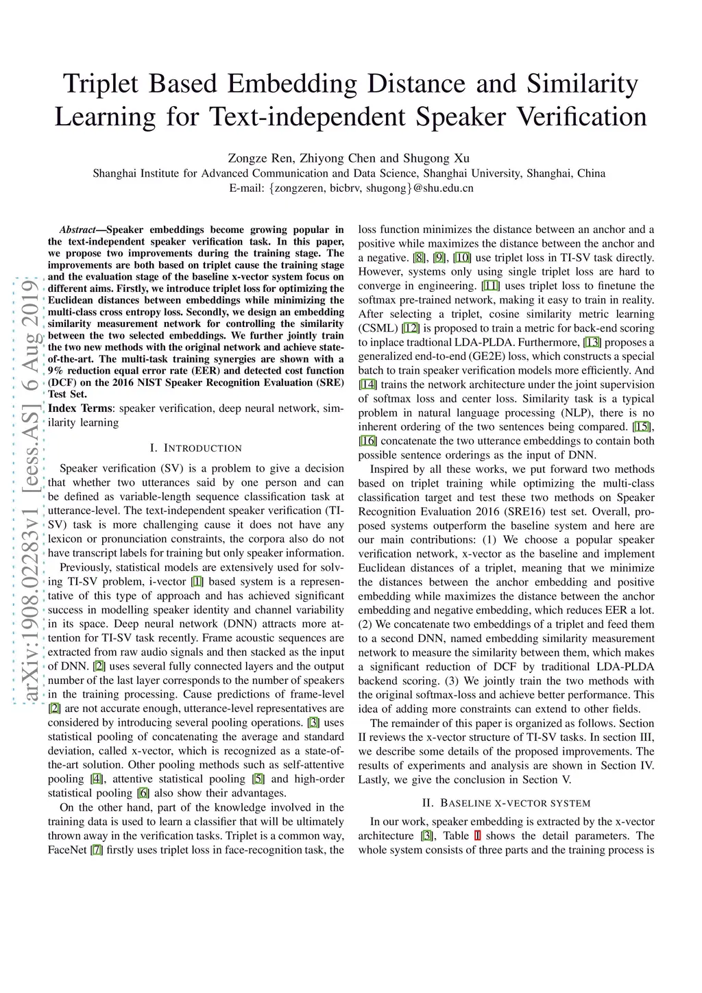 Speaker embeddings become growing popular in the text-independent speaker verification task. In this paper, we propose two improvements during the training stage. The improvements are both based on triplet cause the training stage and the evaluation stage of the baseline x-vector system focus on different aims. Firstly, we introduce triplet loss for optimizing the Euclidean distances between embeddings while minimizing the multi-class cross entropy loss. Secondly, we design an embedding similarity measurement network for controlling the similarity between the two selected embeddings. We further jointly train the two new methods with the original network and achieve state-of-the-art. The multi-task training synergies are shown with a 9% reduction equal error rate (EER) and detected cost function (DCF) on the 2016 NIST Speaker Recognition Evaluation (SRE) Test Set.
