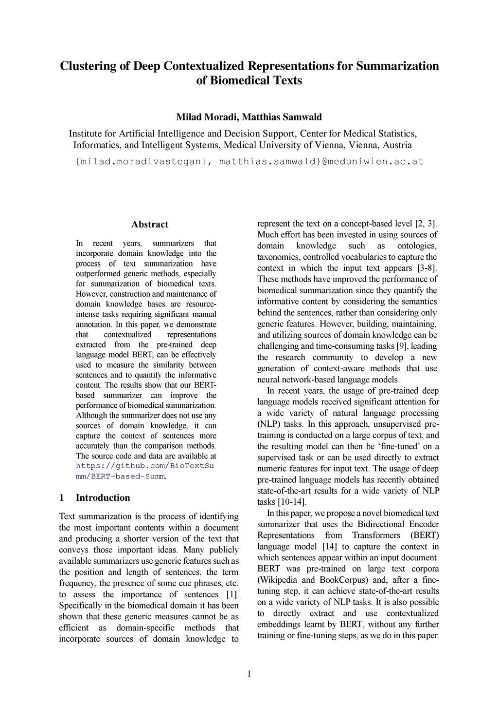 In recent years, summarizers that incorporate domain knowledge into the process of text summarization have outperformed generic methods, especially for summarization of biomedical texts. However, construction and maintenance of domain knowledge bases are resource-intense tasks requiring significant manual annotation. In this paper, we demonstrate that contextualized representations extracted from the pre-trained deep language model BERT, can be effectively used to measure the similarity between sentences and to quantify the informative content. The results show that our BERT-based summarizer can improve the performance of biomedical summarization. Although the summarizer does not use any sources of domain knowledge, it can capture the context of sentences more accurately than the comparison methods. The source code and data are available at https://github.com/BioTextSumm/BERT-based-Summ.