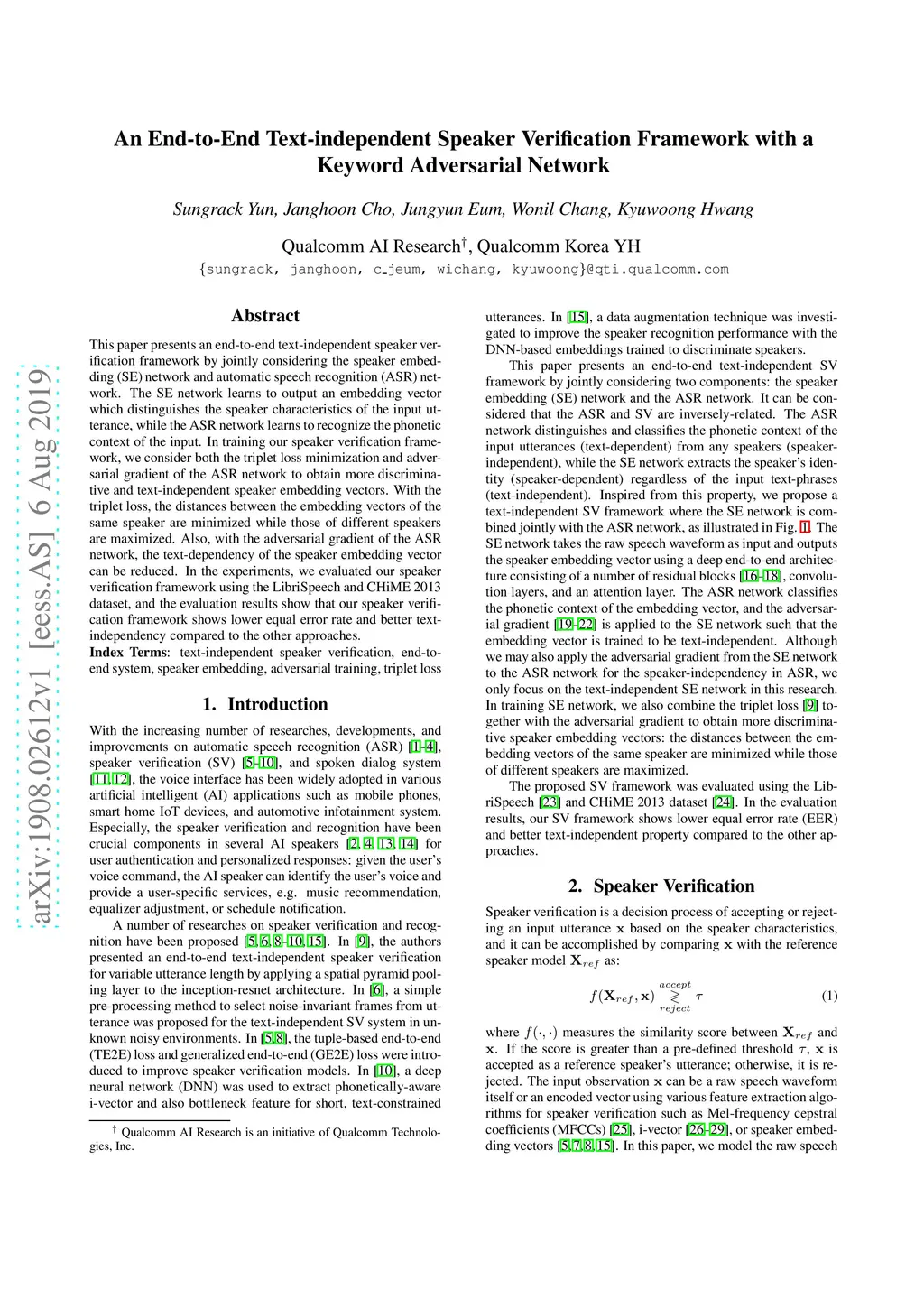 This paper presents an end-to-end text-independent speaker verification framework by jointly considering the speaker embedding (SE) network and automatic speech recognition (ASR) network. The SE network learns to output an embedding vector which distinguishes the speaker characteristics of the input utterance, while the ASR network learns to recognize the phonetic context of the input. In training our speaker verification framework, we consider both the triplet loss minimization and adversarial gradient of the ASR network to obtain more discriminative and text-independent speaker embedding vectors. With the triplet loss, the distances between the embedding vectors of the same speaker are minimized while those of different speakers are maximized. Also, with the adversarial gradient of the ASR network, the text-dependency of the speaker embedding vector can be reduced. In the experiments, we evaluated our speaker verification framework using the LibriSpeech and CHiME 2013 dataset, and the evaluation results show that our speaker verification framework shows lower equal error rate and better text-independency compared to the other approaches.