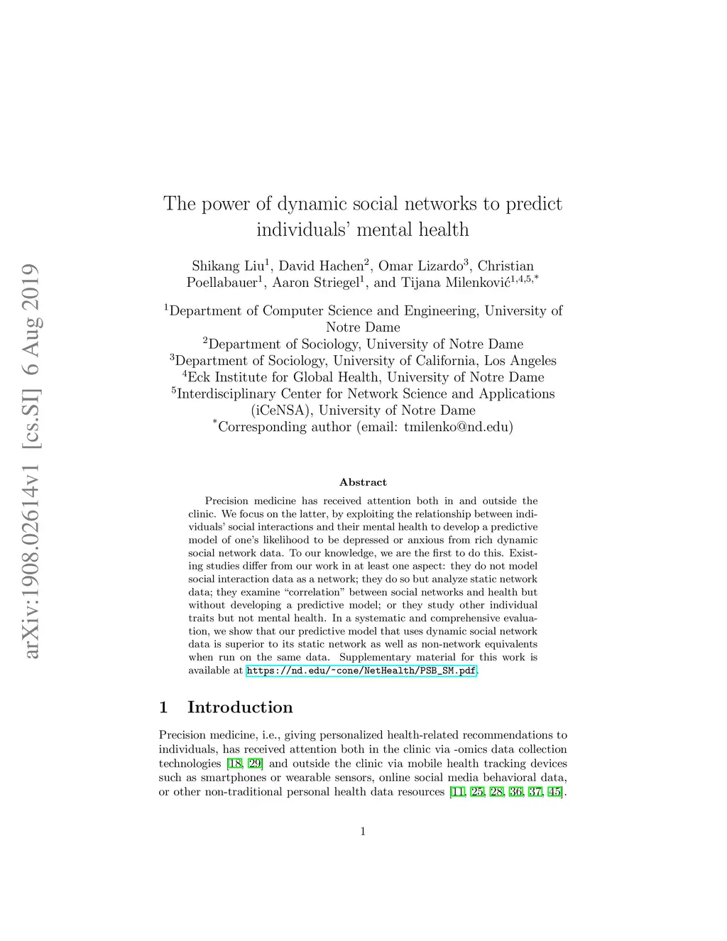 Precision medicine has received attention both in and outside the clinic. We focus on the latter, by exploiting the relationship between individuals' social interactions and their mental health to develop a predictive model of one's likelihood to be depressed or anxious from rich dynamic social network data. To our knowledge, we are the first to do this. Existing studies differ from our work in at least one aspect: they do not model social interaction data as a network; they do so but analyze static network data; they examine "correlation" between social networks and health but without developing a predictive model; or they study other individual traits but not mental health. In a systematic and comprehensive evaluation, we show that our predictive model that uses dynamic social network data is superior to its static network as well as non-network equivalents when run on the same data.