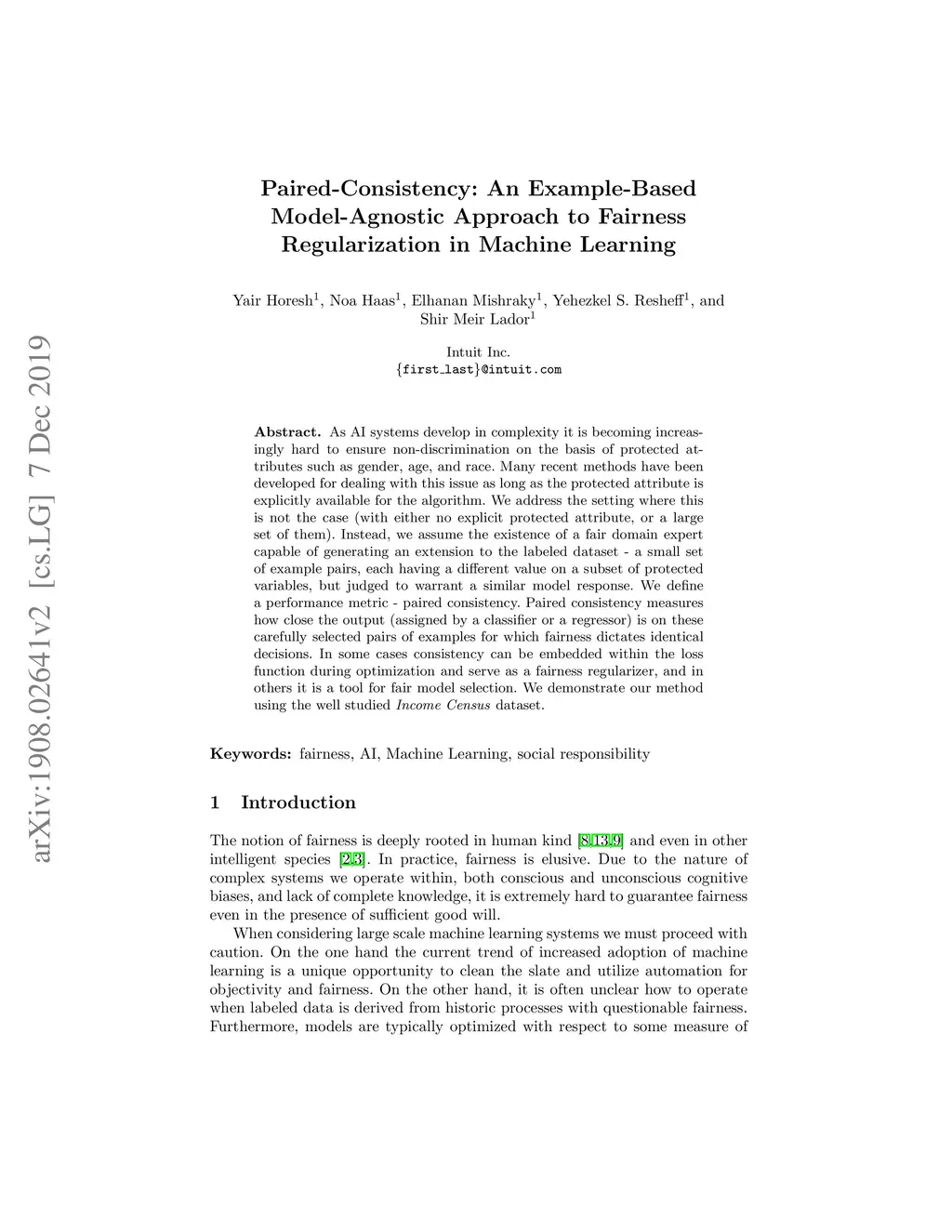 As AI systems develop in complexity it is becoming increasingly hard to ensure non-discrimination on the basis of protected attributes such as gender, age, and race. Many recent methods have been developed for dealing with this issue as long as the protected attribute is explicitly available for the algorithm. We address the setting where this is not the case (with either no explicit protected attribute, or a large set of them). Instead, we assume the existence of a fair domain expert capable of generating an extension to the labeled dataset - a small set of example pairs, each having a different value on a subset of protected variables, but judged to warrant a similar model response. We define a performance metric - paired consistency. Paired consistency measures how close the output (assigned by a classifier or a regressor) is on these carefully selected pairs of examples for which fairness dictates identical decisions. In some cases consistency can be embedded within the loss function during optimization and serve as a fairness regularizer, and in others it is a tool for fair model selection. We demonstrate our method using the well studied Income Census dataset.