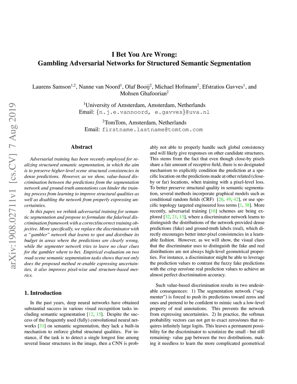 Adversarial training has been recently employed for realizing structured semantic segmentation, in which the aim is to preserve higher-level scene structural consistencies in dense predictions. However, as we show, value-based discrimination between the predictions from the segmentation network and ground-truth annotations can hinder the training process from learning to improve structural qualities as well as disabling the network from properly expressing uncertainties. In this paper, we rethink adversarial training for semantic segmentation and propose to formulate the fake/real discrimination framework with a correct/incorrect training objective. More specifically, we replace the discriminator with a "gambler" network that learns to spot and distribute its budget in areas where the predictions are clearly wrong, while the segmenter network tries to leave no clear clues for the gambler where to bet. Empirical evaluation on two road-scene semantic segmentation tasks shows that not only does the proposed method re-enable expressing uncertainties, it also improves pixel-wise and structure-based metrics.