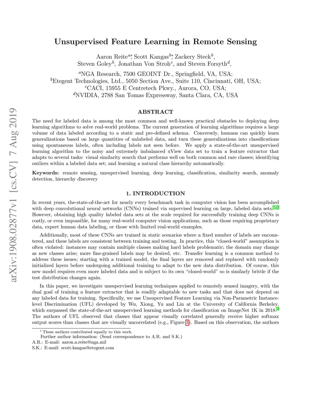 The need for labeled data is among the most common and well-known practical obstacles to deploying deep learning algorithms to solve real-world problems. The current generation of learning algorithms requires a large volume of data labeled according to a static and pre-defined schema. Conversely, humans can quickly learn generalizations based on large quantities of unlabeled data, and turn these generalizations into classifications using spontaneous labels, often including labels not seen before. We apply a state-of-the-art unsupervised learning algorithm to the noisy and extremely imbalanced xView data set to train a feature extractor that adapts to several tasks: visual similarity search that performs well on both common and rare classes; identifying outliers within a labeled data set; and learning a natural class hierarchy automatically.