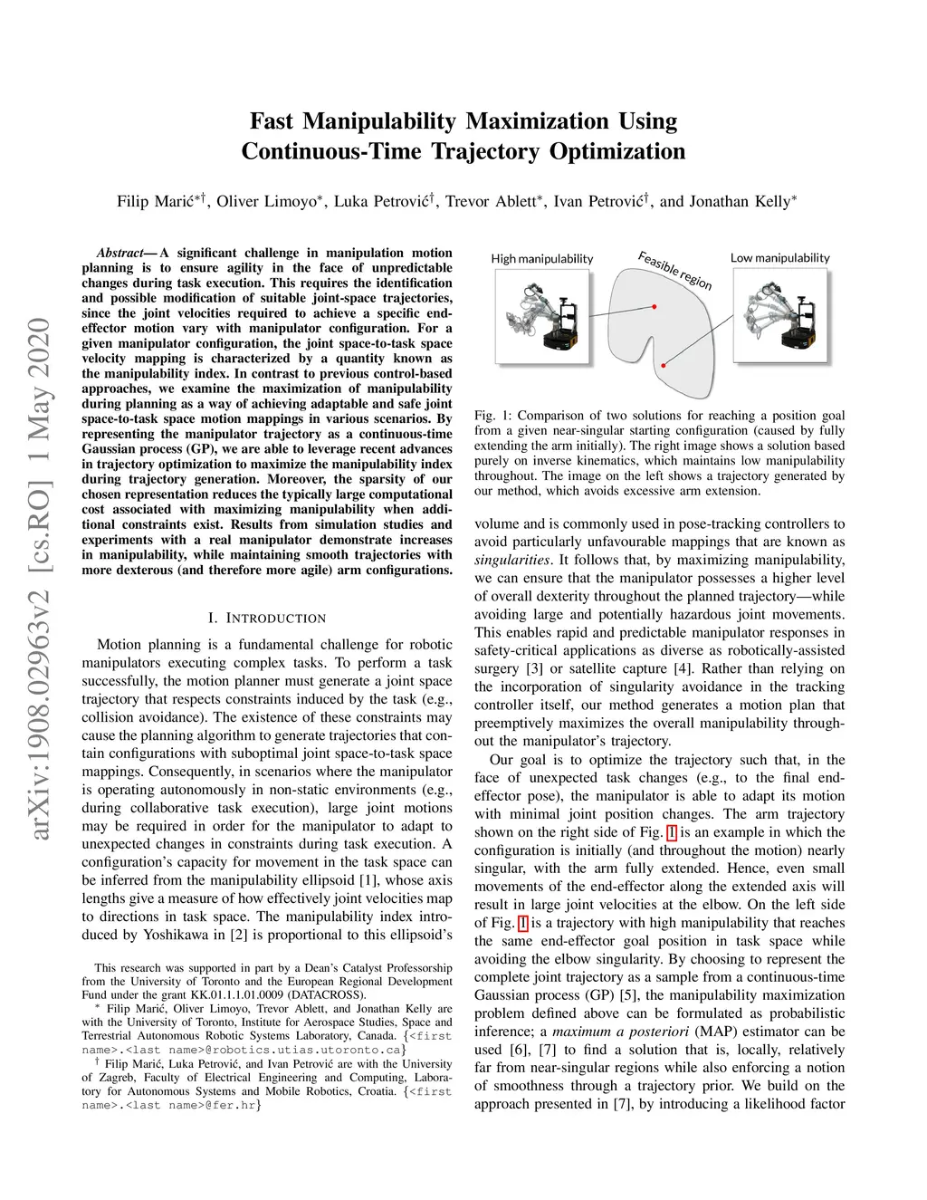 Fast Manipulability Maximization Using Continuous-Time Trajectory