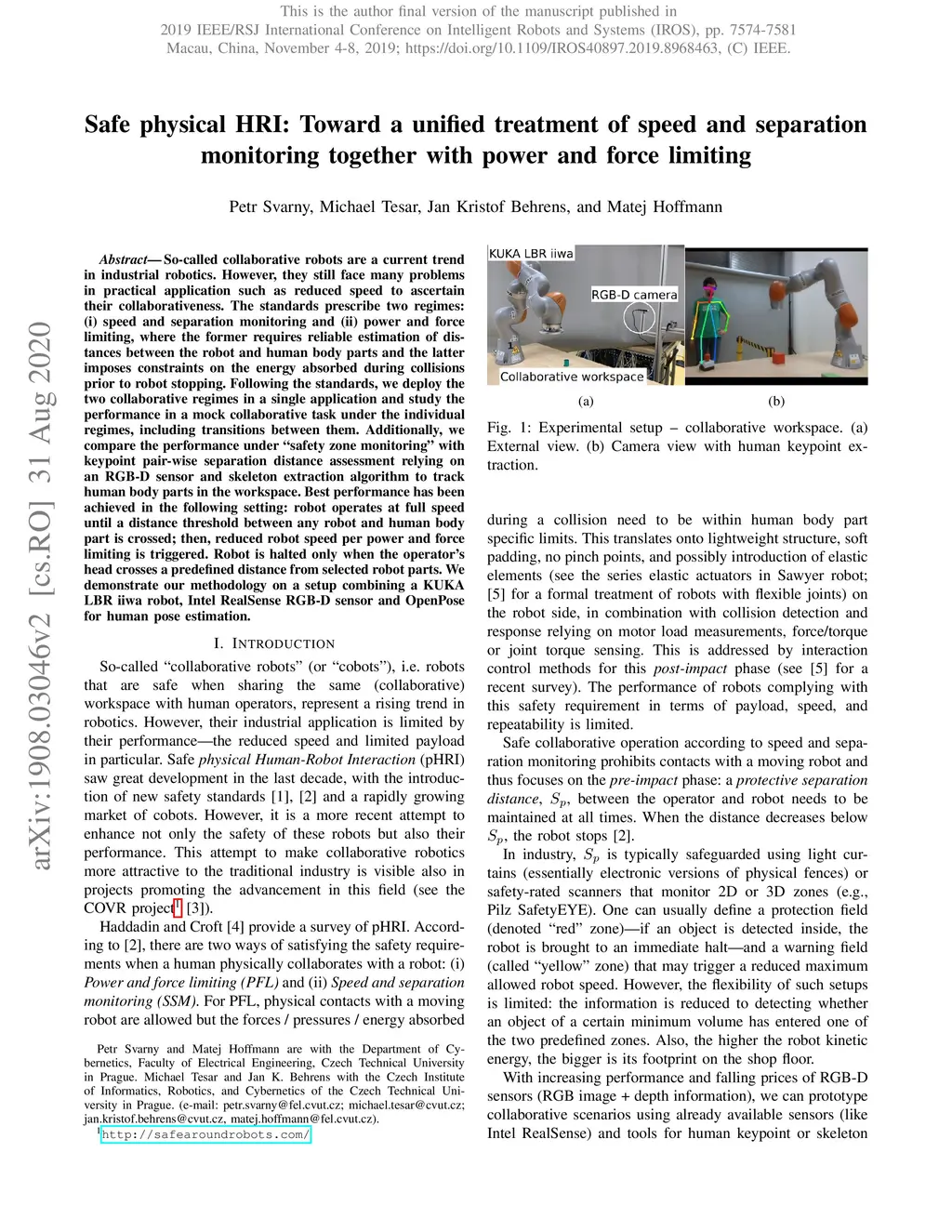 So-called collaborative robots are a current trend in industrial robotics. However, they still face many problems in practical application such as reduced speed to ascertain their collaborativeness. The standards prescribe two regimes: (i) speed and separation monitoring and (ii) power and force limiting, where the former requires reliable estimation of distances between the robot and human body parts and the latter imposes constraints on the energy absorbed during collisions prior to robot stopping. Following the standards, we deploy the two collaborative regimes in a single application and study the performance in a mock collaborative task under the individual regimes, including transitions between them. Additionally, we compare the performance under "safety zone monitoring" with keypoint pair-wise separation distance assessment relying on an RGB-D sensor and skeleton extraction algorithm to track human body parts in the workspace. Best performance has been achieved in the following setting: robot operates at full speed until a distance threshold between any robot and human body part is crossed; then, reduced robot speed per power and force limiting is triggered. Robot is halted only when the operator's head crosses a predefined distance from selected robot parts. We demonstrate our methodology on a setup combining a KUKA LBR iiwa robot, Intel RealSense RGB-D sensor and OpenPose for human pose estimation.