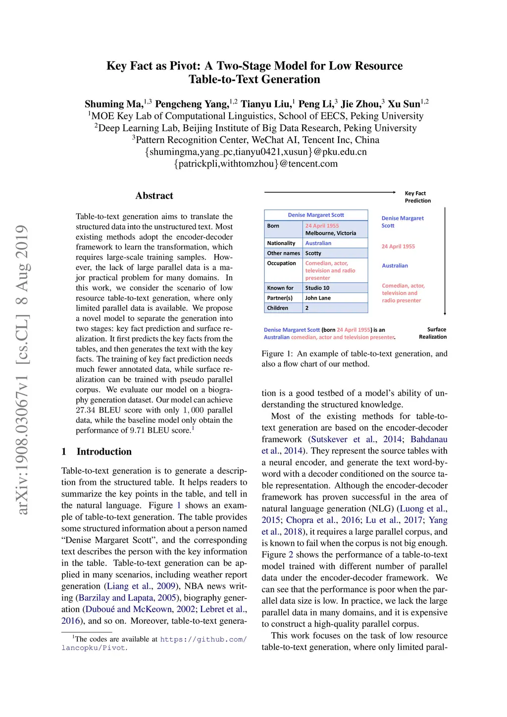 Key Fact as Pivot: A Two-Stage Model for Low Resource Table-to-Text