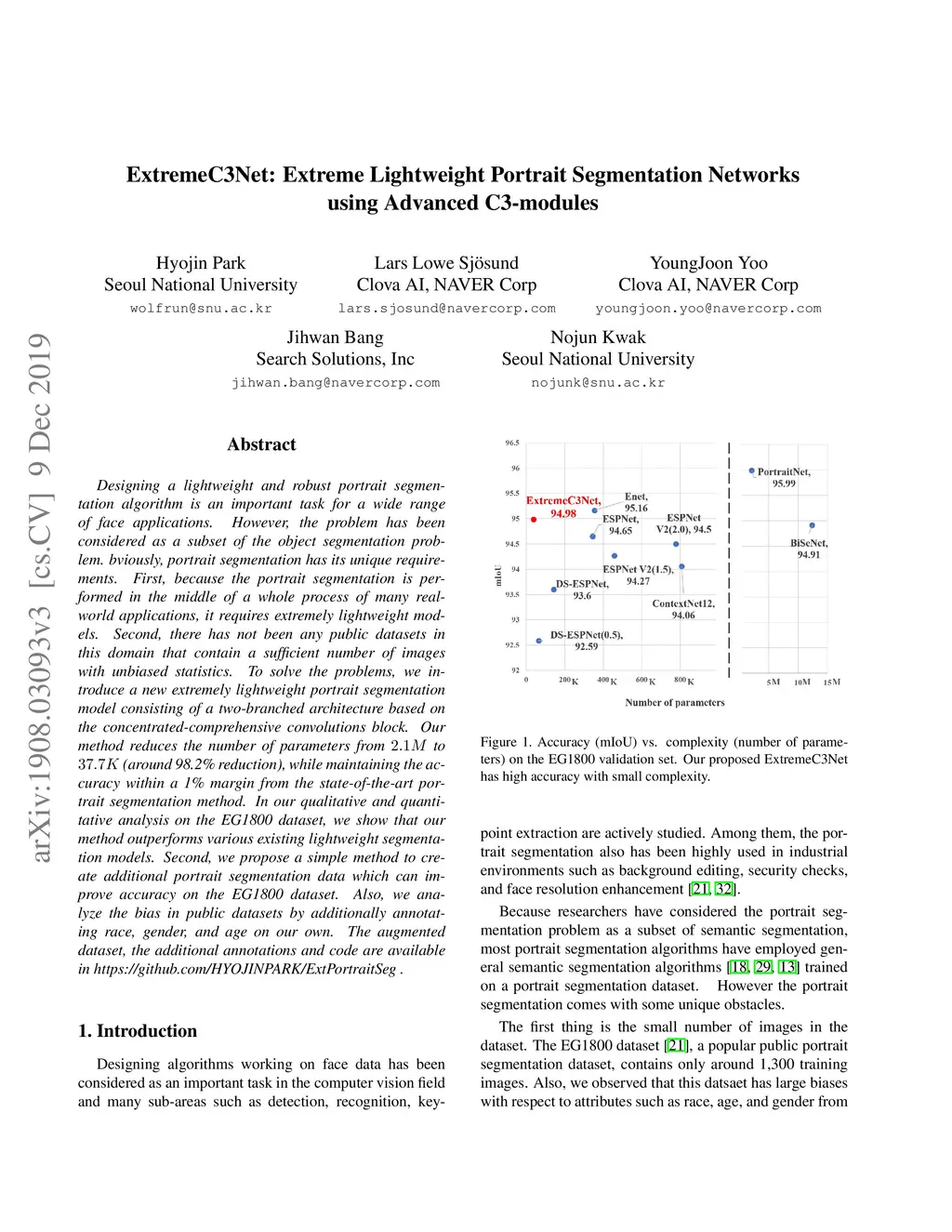 Designing a lightweight and robust portrait segmentation algorithm is an important task for a wide range of face applications. However, the problem has been considered as a subset of the object segmentation problem. bviously, portrait segmentation has its unique requirements. First, because the portrait segmentation is performed in the middle of a whole process of many realworld applications, it requires extremely lightweight models. Second, there has not been any public datasets in this domain that contain a sufficient number of images with unbiased statistics. To solve the problems, we introduce a new extremely lightweight portrait segmentation model consisting of a two-branched architecture based on the concentrated-comprehensive convolutions block. Our method reduces the number of parameters from 2.1M to 37.7K (around 98.2% reduction), while maintaining the accuracy within a 1% margin from the state-of-the-art portrait segmentation method. In our qualitative and quantitative analysis on the EG1800 dataset, we show that our method outperforms various existing lightweight segmentation models. Second, we propose a simple method to create additional portrait segmentation data which can improve accuracy on the EG1800 dataset. Also, we analyze the bias in public datasets by additionally annotating race, gender, and age on our own. The augmented dataset, the additional annotations and code are available in https://github.com/HYOJINPARK/ExtPortraitSeg .
