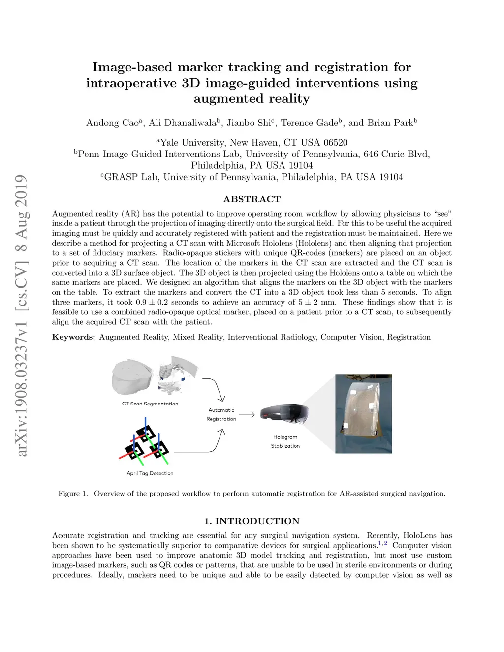 Augmented reality has the potential to improve operating room workflow by allowing physicians to "see" inside a patient through the projection of imaging directly onto the surgical field. For this to be useful the acquired imaging must be quickly and accurately registered with patient and the registration must be maintained. Here we describe a method for projecting a CT scan with Microsoft Hololens and then aligning that projection to a set of fiduciary markers. Radio-opaque stickers with unique QR-codes are placed on an object prior to acquiring a CT scan. The location of the markers in the CT scan are extracted and the CT scan is converted into a 3D surface object. The 3D object is then projected using the Hololens onto a table on which the same markers are placed. We designed an algorithm that aligns the markers on the 3D object with the markers on the table. To extract the markers and convert the CT into a 3D object took less than 5 seconds. To align three markers, it took seconds to achieve an accuracy of mm. These findings show that it is feasible to use a combined radio-opaque optical marker, placed on a patient prior to a CT scan, to subsequently align the acquired CT scan with the patient.