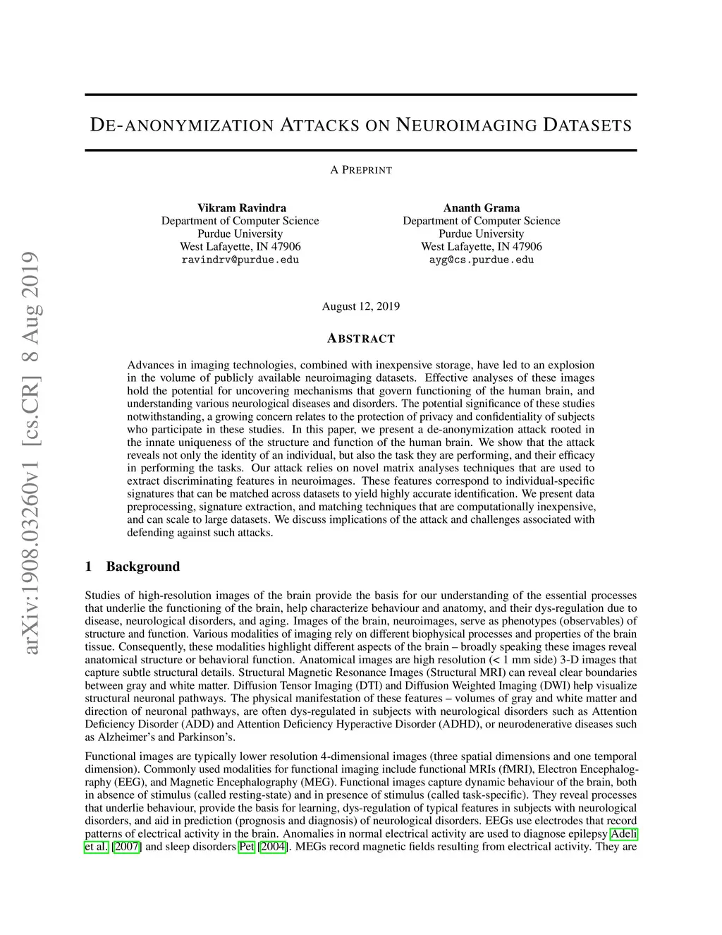 Advances in imaging technologies, combined with inexpensive storage, have led to an explosion in the volume of publicly available neuroimaging datasets. Effective analyses of these images hold the potential for uncovering mechanisms that govern functioning of the human brain, and understanding various neurological diseases and disorders. The potential significance of these studies notwithstanding, a growing concern relates to the protection of privacy and confidentiality of subjects who participate in these studies. In this paper, we present a de-anonymization attack rooted in the innate uniqueness of the structure and function of the human brain. We show that the attack reveals not only the identity of an individual, but also the task they are performing, and their efficacy in performing the tasks. Our attack relies on novel matrix analyses techniques that are used to extract discriminating features in neuroimages. These features correspond to individual-specific signatures that can be matched across datasets to yield highly accurate identification. We present data preprocessing, signature extraction, and matching techniques that are computationally inexpensive, and can scale to large datasets. We discuss implications of the attack and challenges associated with defending against such attacks.