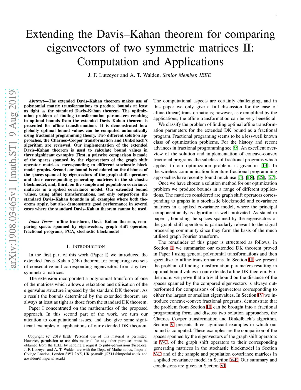 The extended Davis-Kahan theorem makes use of polynomial matrix transformations to produce bounds at least as tight as the standard Davis-Kahan theorem. The optimization problem of finding transformation parameters resulting in optimal bounds from the extended Davis-Kahan theorem is presented for affine transformations. It is demonstrated how globally optimal bound values can be computed automatically using fractional programming theory. Two different solution approaches, the Charnes-Cooper transformation and Dinkelbach's algorithm are reviewed. Our implementation of the extended Davis--Kahan theorem is used to calculate bound values in three significant examples. First, a pairwise comparison is made of the spaces spanned by the eigenvectors of the graph shift operator matrices corresponding to different stochastic block model graphs. Second our bound is calculated on the distance of the spaces spanned by eigenvectors of the graph shift operators and their corresponding generating matrices in the stochastic blockmodel, and, third, on the sample and population covariance matrices in a spiked covariance model. Our extended bound values, using affine transformations, not only outperform the standard Davis-Kahan bounds in all examples where both theorems apply, but also demonstrate good performance in several cases where the standard Davis-Kahan theorem cannot be used.