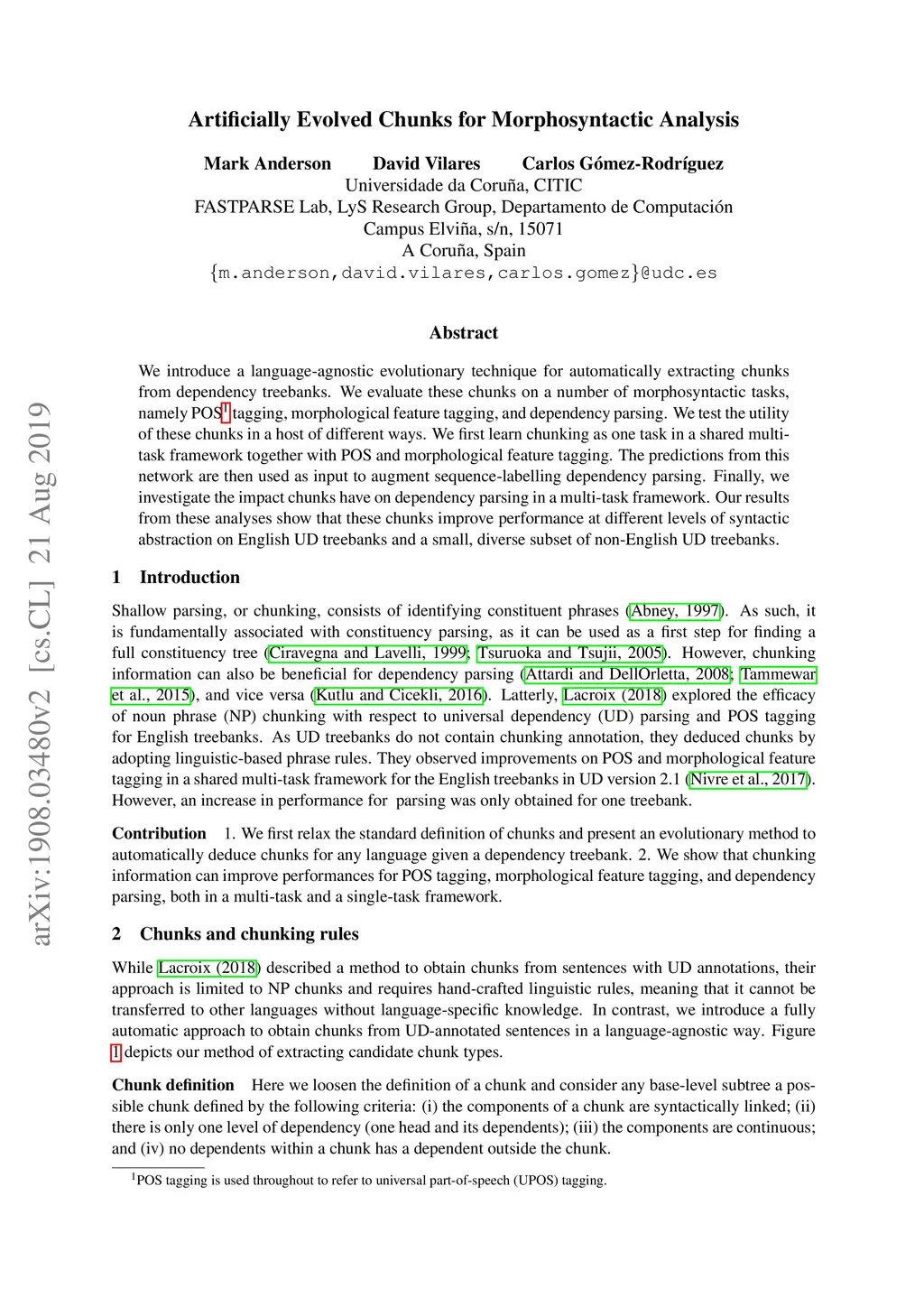 We introduce a language-agnostic evolutionary technique for automatically extracting chunks from dependency treebanks. We evaluate these chunks on a number of morphosyntactic tasks, namely POS tagging, morphological feature tagging, and dependency parsing. We test the utility of these chunks in a host of different ways. We first learn chunking as one task in a shared multi-task framework together with POS and morphological feature tagging. The predictions from this network are then used as input to augment sequence-labelling dependency parsing. Finally, we investigate the impact chunks have on dependency parsing in a multi-task framework. Our results from these analyses show that these chunks improve performance at different levels of syntactic abstraction on English UD treebanks and a small, diverse subset of non-English UD treebanks.