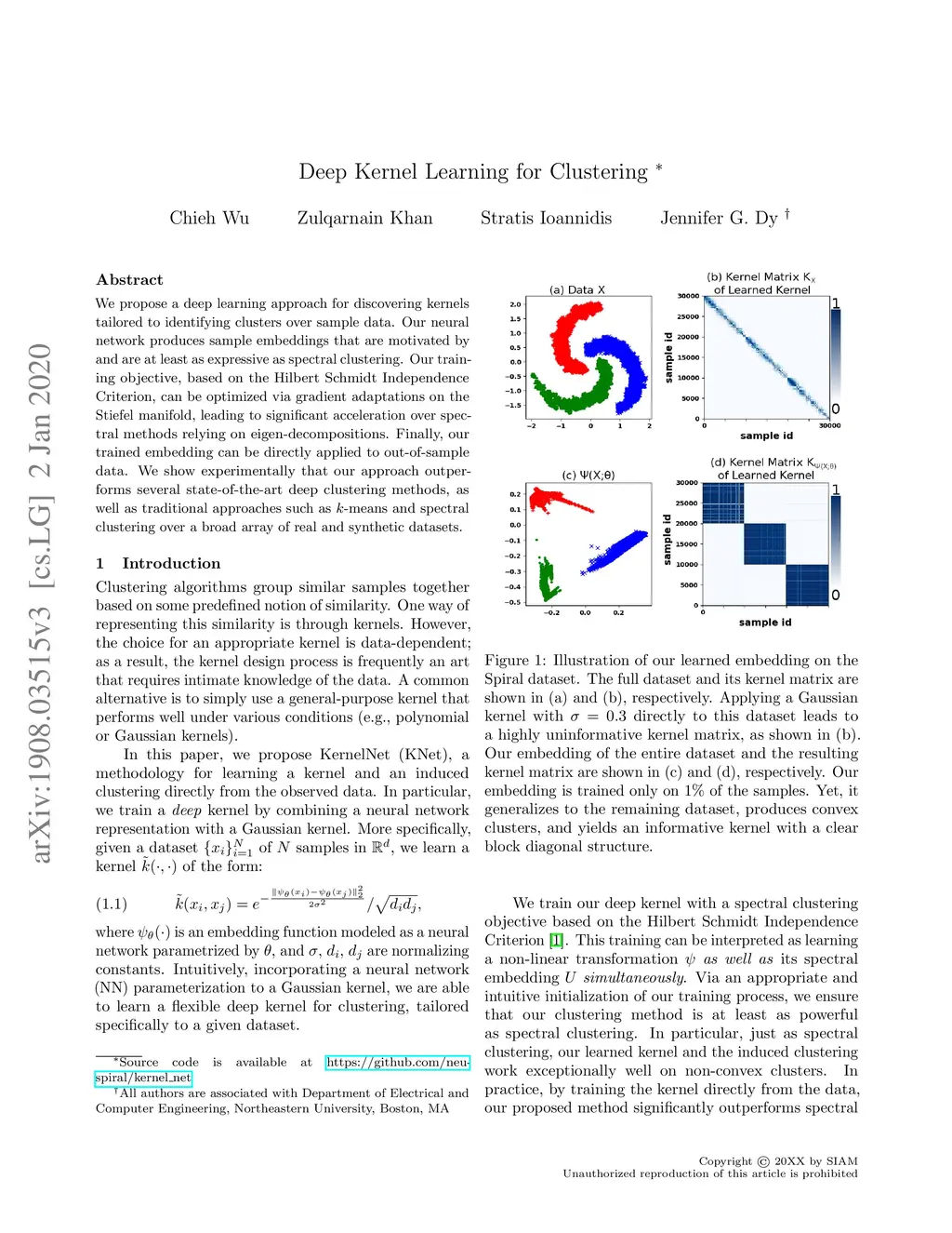 We propose a deep learning approach for discovering kernels tailored to identifying clusters over sample data. Our neural network produces sample embeddings that are motivated by--and are at least as expressive as--spectral clustering. Our training objective, based on the Hilbert Schmidt Information Criterion, can be optimized via gradient adaptations on the Stiefel manifold, leading to significant acceleration over spectral methods relying on eigendecompositions. Finally, our trained embedding can be directly applied to out-of-sample data. We show experimentally that our approach outperforms several state-of-the-art deep clustering methods, as well as traditional approaches such as -means and spectral clustering over a broad array of real-life and synthetic datasets.
