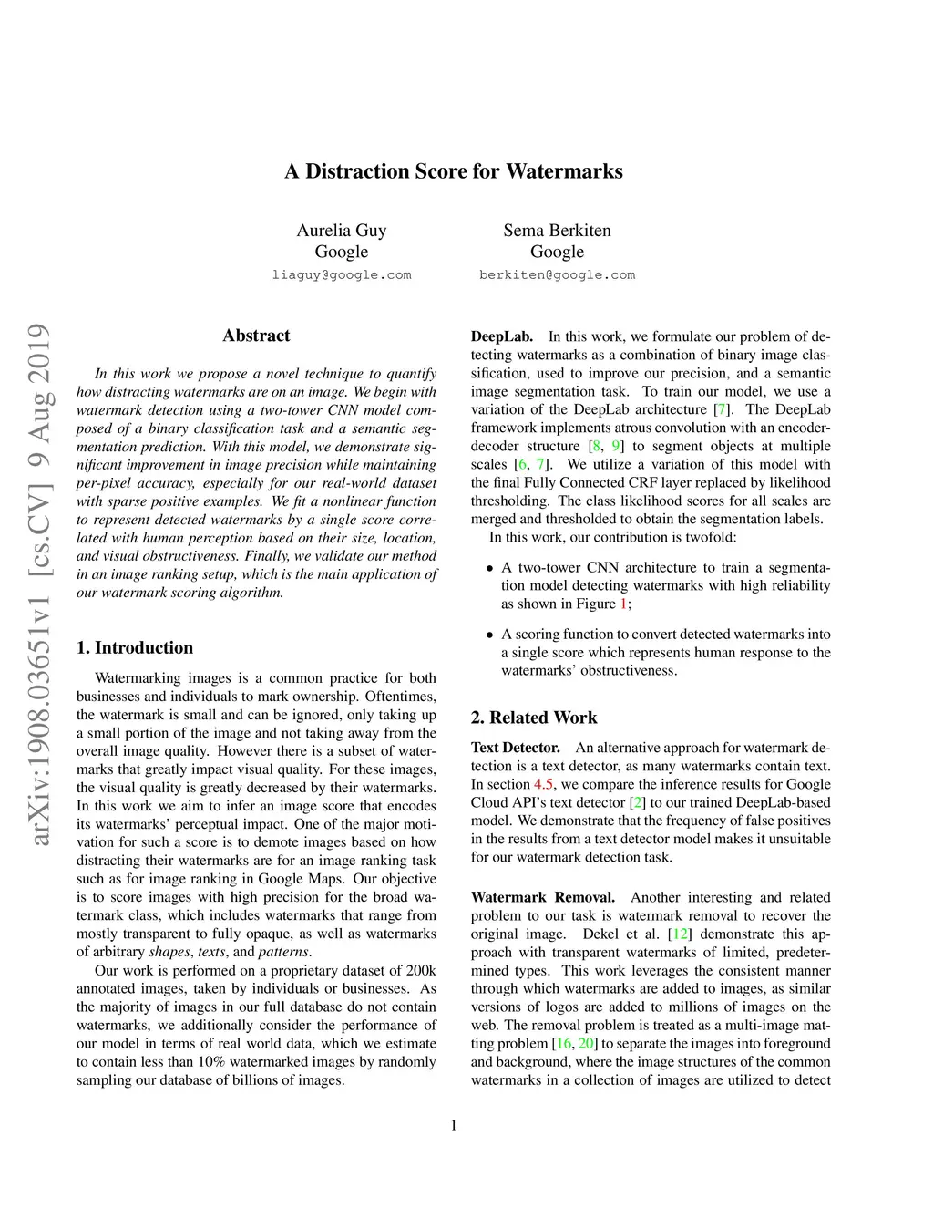 In this work we propose a novel technique to quantify how distracting watermarks are on an image. We begin with watermark detection using a two-tower CNN model composed of a binary classification task and a semantic segmentation prediction. With this model, we demonstrate significant improvement in image precision while maintaining per-pixel accuracy, especially for our real-world dataset with sparse positive examples. We fit a nonlinear function to represent detected watermarks by a single score correlated with human perception based on their size, location, and visual obstructiveness. Finally, we validate our method in an image ranking setup, which is the main application of our watermark scoring algorithm.