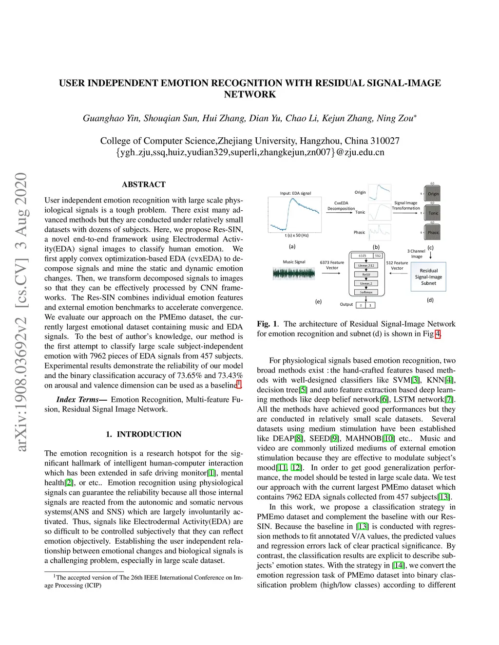 User independent emotion recognition with large scale physiological signals is a tough problem. There exist many advanced methods but they are conducted under relatively small datasets with dozens of subjects. Here, we propose Res-SIN, a novel end-to-end framework using Electrodermal Activity(EDA) signal images to classify human emotion. We first apply convex optimization-based EDA (cvxEDA) to decompose signals and mine the static and dynamic emotion changes. Then, we transform decomposed signals to images so that they can be effectively processed by CNN frameworks. The Res-SIN combines individual emotion features and external emotion benchmarks to accelerate convergence. We evaluate our approach on the PMEmo dataset, the currently largest emotional dataset containing music and EDA signals. To the best of author's knowledge, our method is the first attempt to classify large scale subject-independent emotion with 7962 pieces of EDA signals from 457 subjects. Experimental results demonstrate the reliability of our model and the binary classification accuracy of 73.65% and 73.43% on arousal and valence dimension can be used as a baseline.