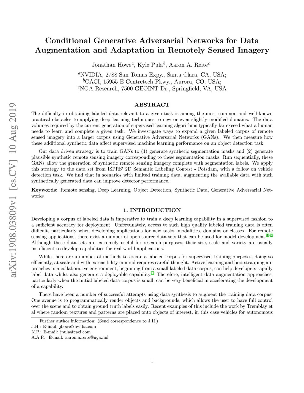 The difficulty in obtaining labeled data relevant to a given task is among the most common and well-known practical obstacles to applying deep learning techniques to new or even slightly modified domains. The data volumes required by the current generation of supervised learning algorithms typically far exceed what a human needs to learn and complete a given task. We investigate ways to expand a given labeled corpus of remote sensed imagery into a larger corpus using Generative Adversarial Networks (GANs). We then measure how these additional synthetic data affect supervised machine learning performance on an object detection task. Our data driven strategy is to train GANs to (1) generate synthetic segmentation masks and (2) generate plausible synthetic remote sensing imagery corresponding to these segmentation masks. Run sequentially, these GANs allow the generation of synthetic remote sensing imagery complete with segmentation labels. We apply this strategy to the data set from ISPRS' 2D Semantic Labeling Contest - Potsdam, with a follow on vehicle detection task. We find that in scenarios with limited training data, augmenting the available data with such synthetically generated data can improve detector performance.