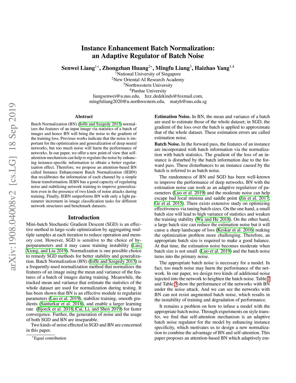 Batch Normalization (BN)(Ioffe and Szegedy 2015) normalizes the features of an input image via statistics of a batch of images and hence BN will bring the noise to the gradient of the training loss. Previous works indicate that the noise is important for the optimization and generalization of deep neural networks, but too much noise will harm the performance of networks. In our paper, we offer a new point of view that self-attention mechanism can help to regulate the noise by enhancing instance-specific information to obtain a better regularization effect. Therefore, we propose an attention-based BN called Instance Enhancement Batch Normalization (IEBN) that recalibrates the information of each channel by a simple linear transformation. IEBN has a good capacity of regulating noise and stabilizing network training to improve generalization even in the presence of two kinds of noise attacks during training. Finally, IEBN outperforms BN with only a light parameter increment in image classification tasks for different network structures and benchmark datasets.