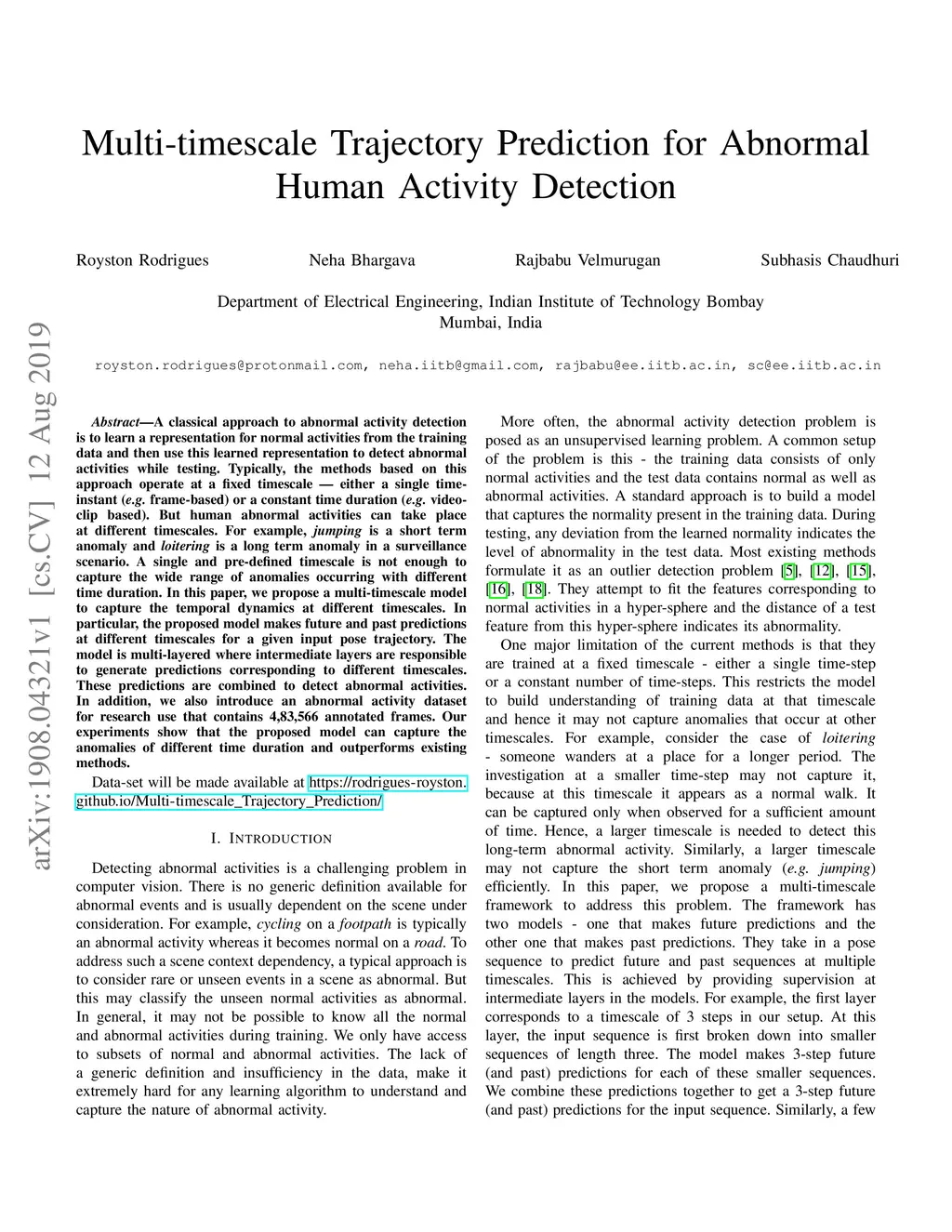A classical approach to abnormal activity detection is to learn a representation for normal activities from the training data and then use this learned representation to detect abnormal activities while testing. Typically, the methods based on this approach operate at a fixed timescale - either a single time-instant (eg. frame-based) or a constant time duration (eg. video-clip based). But human abnormal activities can take place at different timescales. For example, jumping is a short term anomaly and loitering is a long term anomaly in a surveillance scenario. A single and pre-defined timescale is not enough to capture the wide range of anomalies occurring with different time duration. In this paper, we propose a multi-timescale model to capture the temporal dynamics at different timescales. In particular, the proposed model makes future and past predictions at different timescales for a given input pose trajectory. The model is multi-layered where intermediate layers are responsible to generate predictions corresponding to different timescales. These predictions are combined to detect abnormal activities. In addition, we also introduce an abnormal activity data-set for research use that contains 4,83,566 annotated frames. Data-set will be made available at https://rodrigues-royston.github.io/Multi-timescale_Trajectory_Prediction/ Our experiments show that the proposed model can capture the anomalies of different time duration and outperforms existing methods.