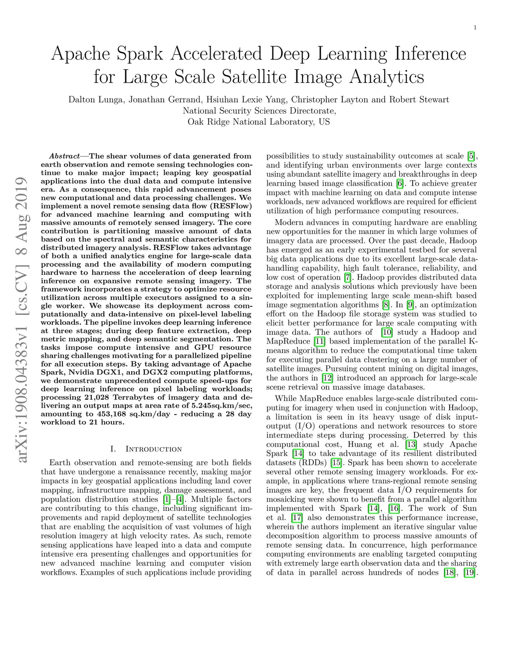 The shear volumes of data generated from earth observation and remote sensing technologies continue to make major impact; leaping key geospatial applications into the dual data and compute intensive era. As a consequence, this rapid advancement poses new computational and data processing challenges. We implement a novel remote sensing data flow (RESFlow) for advanced machine learning and computing with massive amounts of remotely sensed imagery. The core contribution is partitioning massive amount of data based on the spectral and semantic characteristics for distributed imagery analysis. RESFlow takes advantage of both a unified analytics engine for large-scale data processing and the availability of modern computing hardware to harness the acceleration of deep learning inference on expansive remote sensing imagery. The framework incorporates a strategy to optimize resource utilization across multiple executors assigned to a single worker. We showcase its deployment across computationally and data-intensive on pixel-level labeling workloads. The pipeline invokes deep learning inference at three stages; during deep feature extraction, deep metric mapping, and deep semantic segmentation. The tasks impose compute intensive and GPU resource sharing challenges motivating for a parallelized pipeline for all execution steps. By taking advantage of Apache Spark, Nvidia DGX1, and DGX2 computing platforms, we demonstrate unprecedented compute speed-ups for deep learning inference on pixel labeling workloads; processing 21,028~Terrabytes of imagery data and delivering an output maps at area rate of 5.245sq.km/sec, amounting to 453,168 sq.km/day - reducing a 28 day workload to 21~hours.