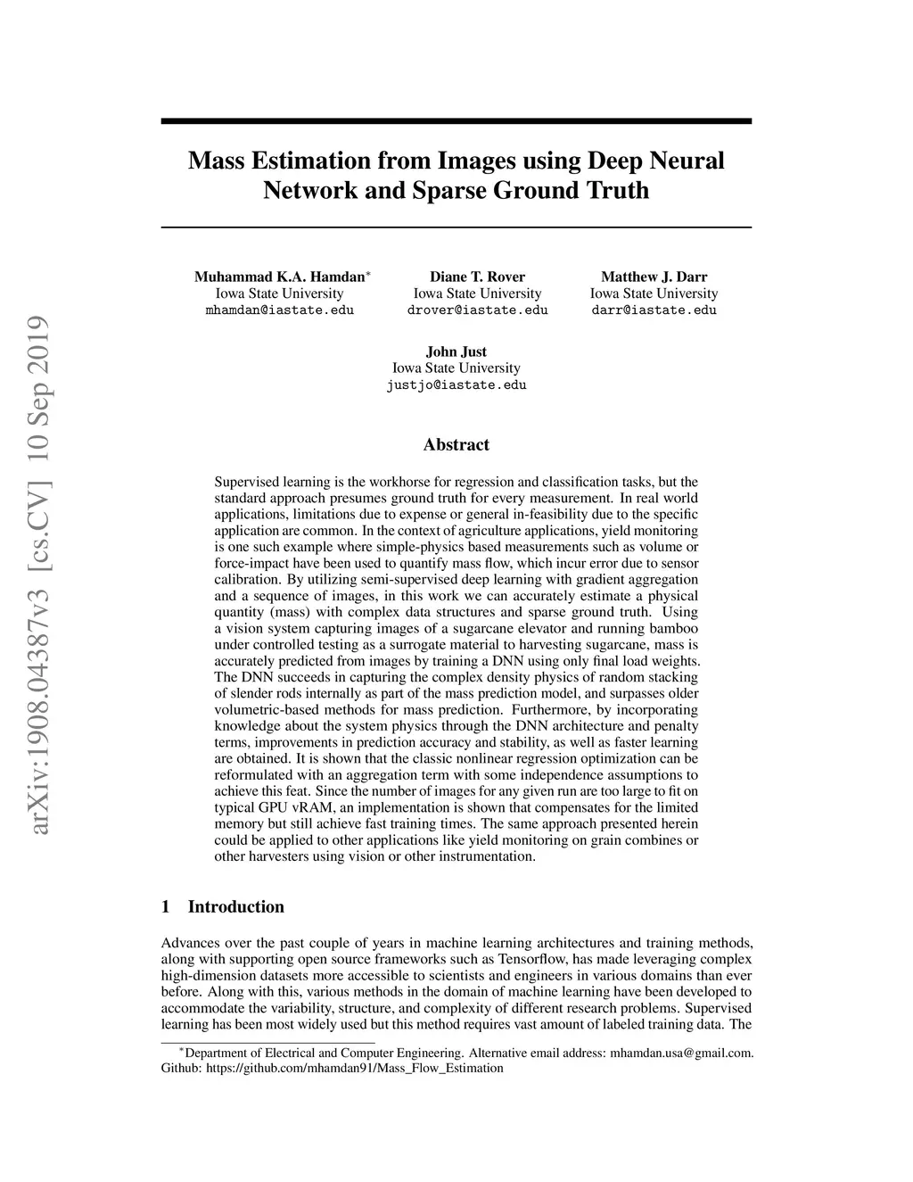Supervised learning is the workhorse for regression and classification tasks, but the standard approach presumes ground truth for every measurement. In real world applications, limitations due to expense or general in-feasibility due to the specific application are common. In the context of agriculture applications, yield monitoring is one such example where simple-physics based measurements such as volume or force-impact have been used to quantify mass flow, which incur error due to sensor calibration. By utilizing semi-supervised deep learning with gradient aggregation and a sequence of images, in this work we can accurately estimate a physical quantity (mass) with complex data structures and sparse ground truth. Using a vision system capturing images of a sugarcane elevator and running bamboo under controlled testing as a surrogate material to harvesting sugarcane, mass is accurately predicted from images by training a DNN using only final load weights. The DNN succeeds in capturing the complex density physics of random stacking of slender rods internally as part of the mass prediction model, and surpasses older volumetric-based methods for mass prediction. Furthermore, by incorporating knowledge about the system physics through the DNN architecture and penalty terms, improvements in prediction accuracy and stability, as well as faster learning are obtained. It is shown that the classic nonlinear regression optimization can be reformulated with an aggregation term with some independence assumptions to achieve this feat. Since the number of images for any given run are too large to fit on typical GPU vRAM, an implementation is shown that compensates for the limited memory but still achieve fast training times. The same approach presented herein could be applied to other applications like yield monitoring on grain combines or other harvesters using vision or other instrumentation.